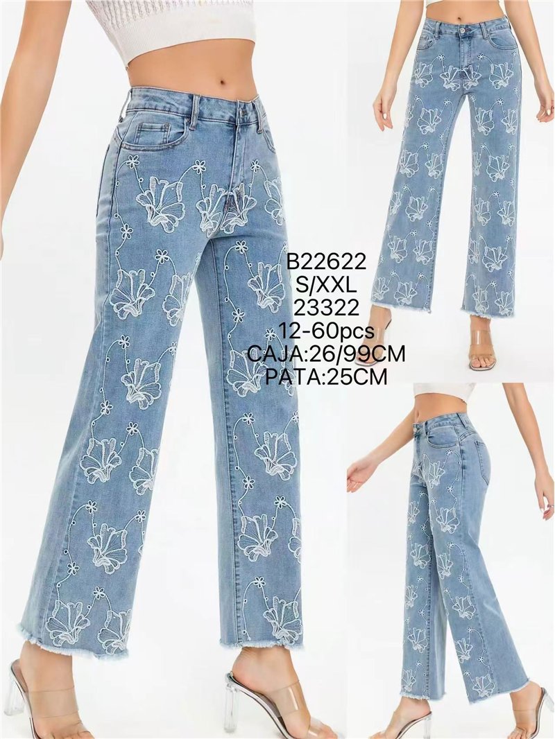 Jeans rectos. Bordado floral integral en contraste. Tiro alto. Cinco bolsillos. Cierre frontal con cremallera y botón metálico. Tiro 26 cm. Largo 99 cm. Bajo 25 cm.