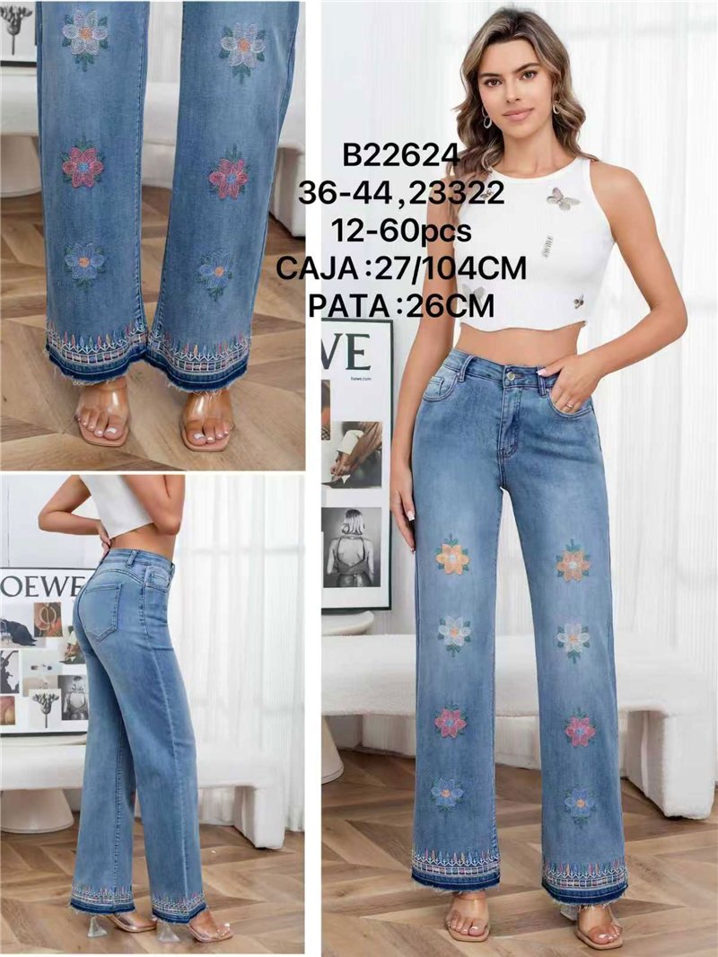 Jeans rectos. Flores bordadas multicolor. Detalle cenefa bordada en el bajo. Tiro alto. Cinco bolsillos. Cierre frontal con cremallera y botón metálico. Tiro 27 cm. Largo 104 cm. Bajo 26 cm.