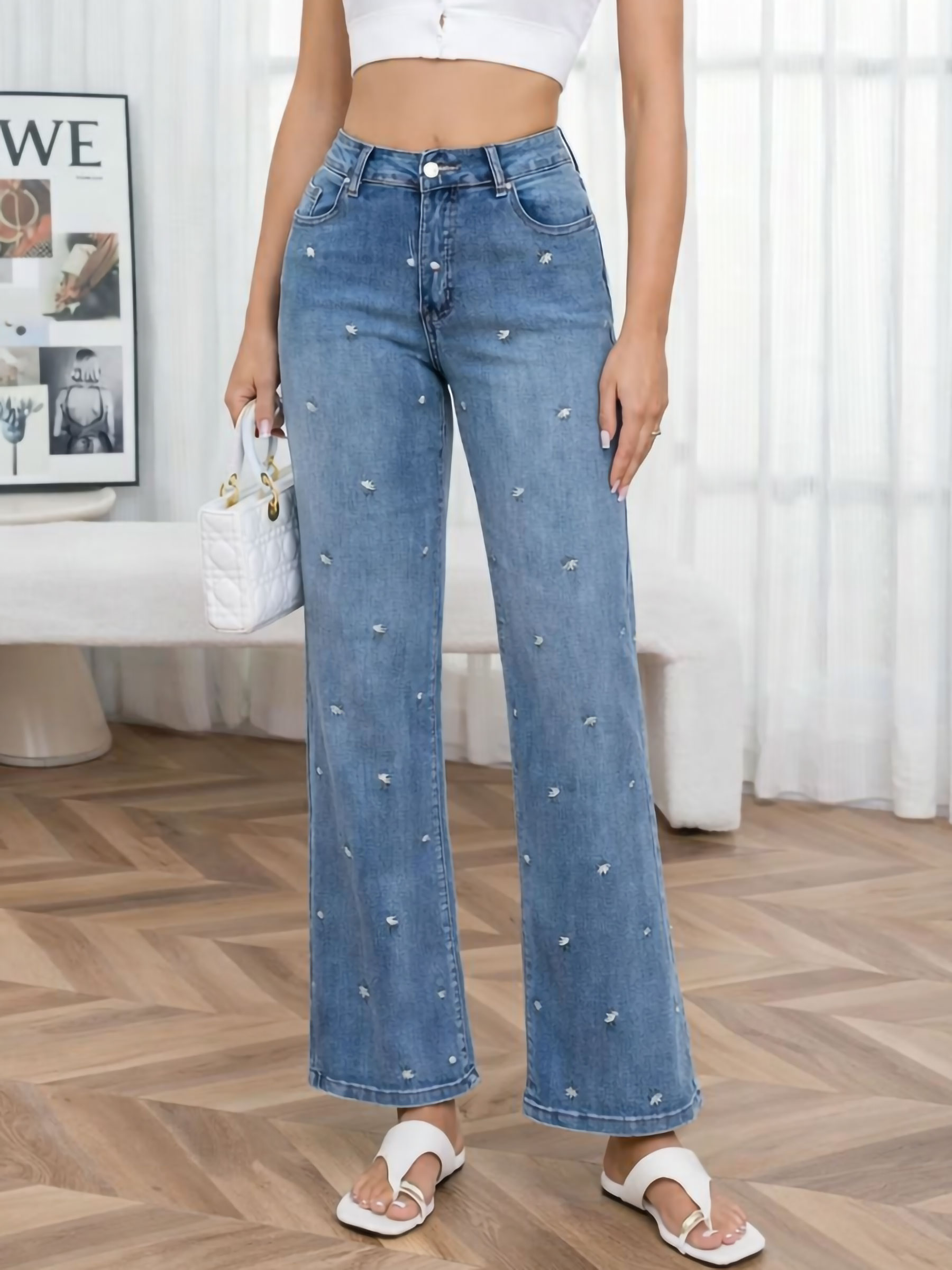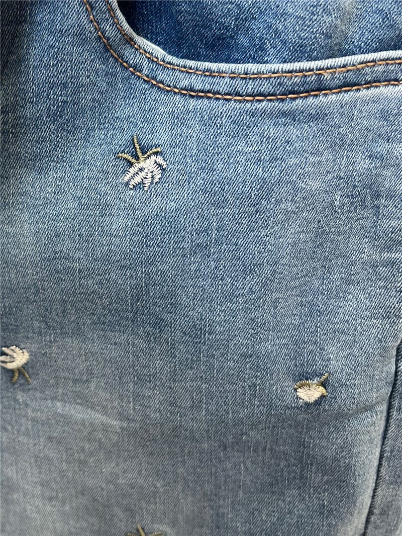 Jeans rectos bordados. Tiro alto. Cinco bolsillos. Cierre frontal con cremallera y botón metálico. Tiro 27 cm. Largo 98 cm. Bajo 22 cm.