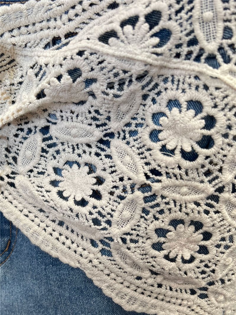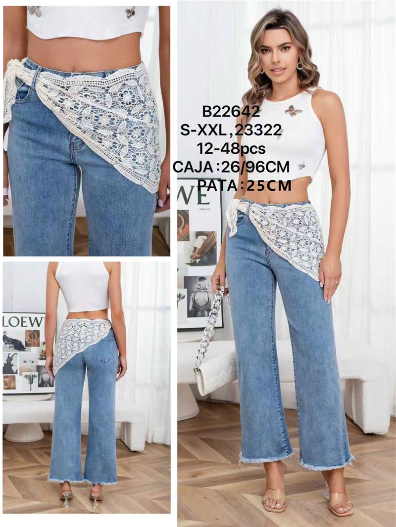 Jeans rectos. Detalle pareo de crochet en la cadera. Tiro alto. Cinco bolsillos. Cierre frontal con cremallera y botón metálico. Tiro 26 cm. Largo 96 cm. Bajo 25 cm.