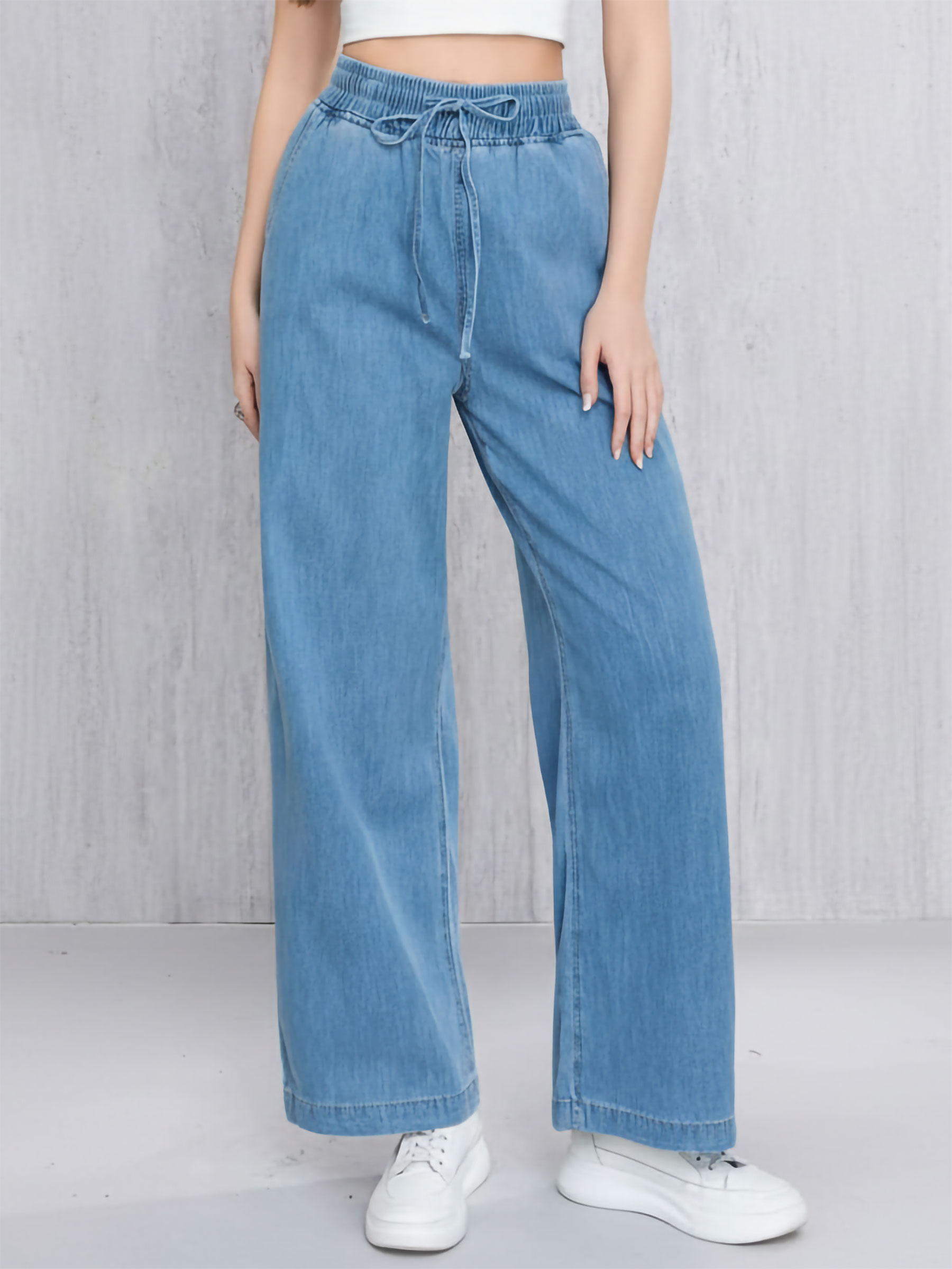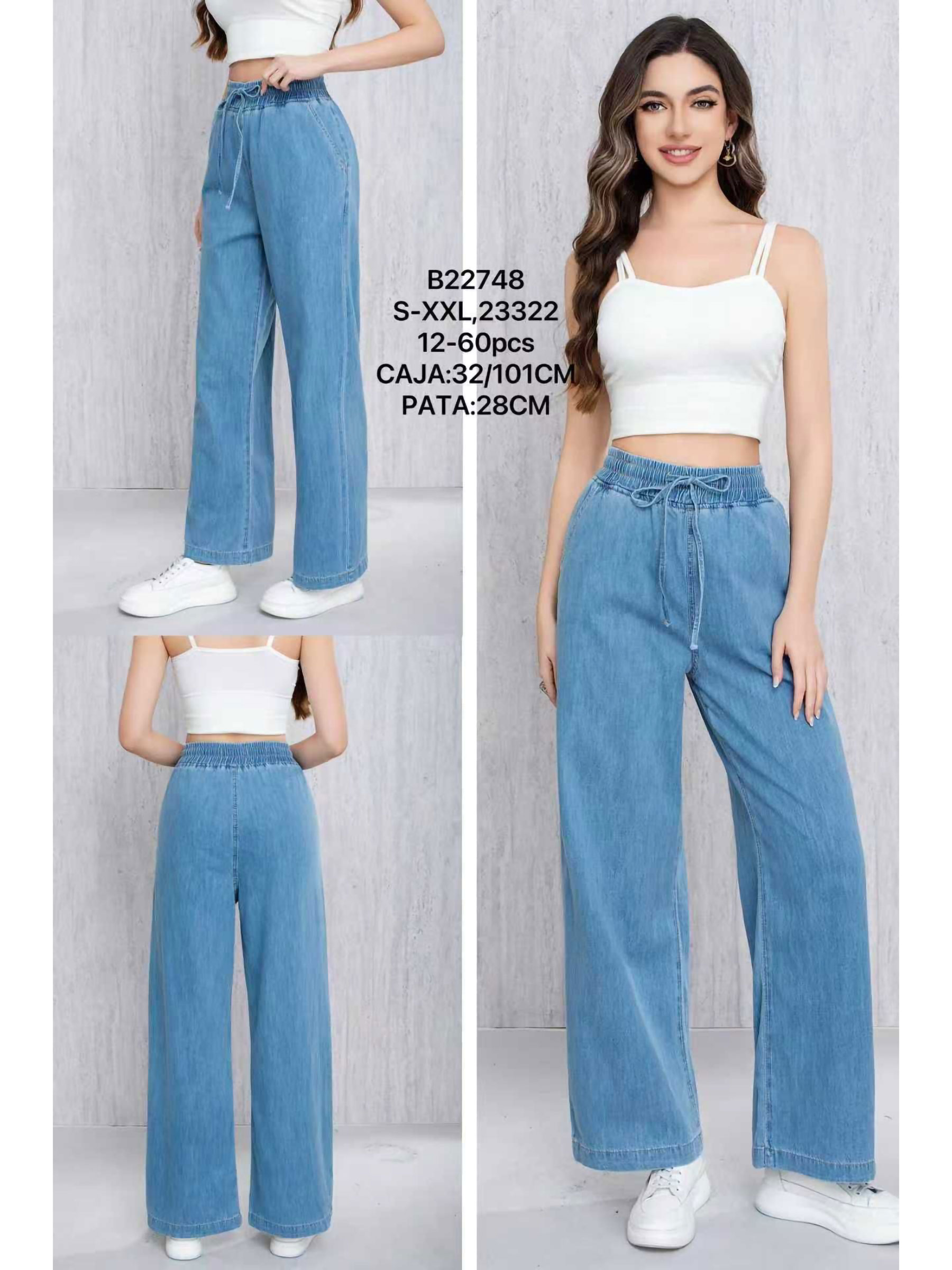 Pantalón denim ancho. Cintura elástica con cordón ajustable. Bolsillos laterales. Tejido no elástico. Tiro 32 cm. Largo 101 cm. Bajo 28 cm.