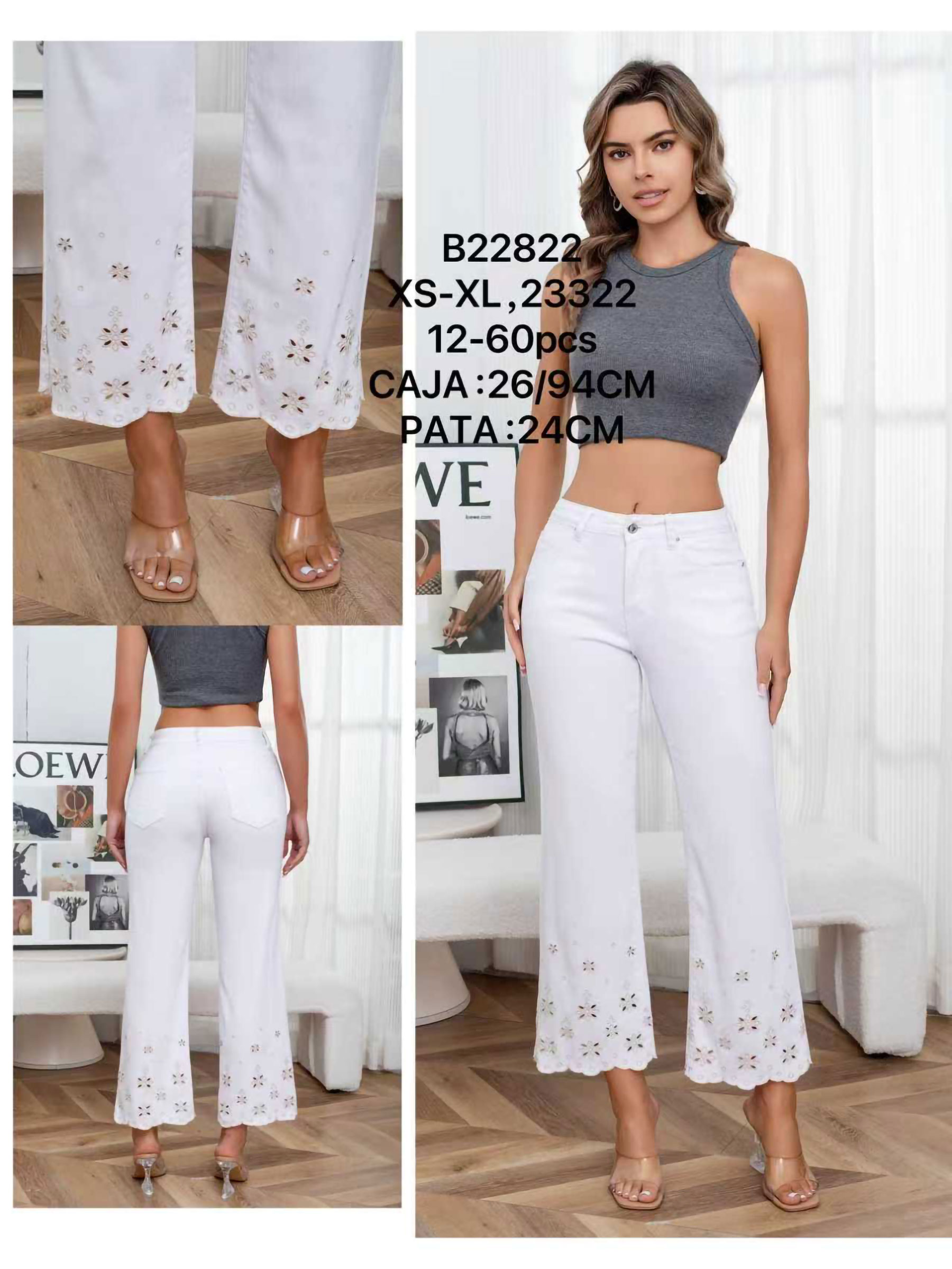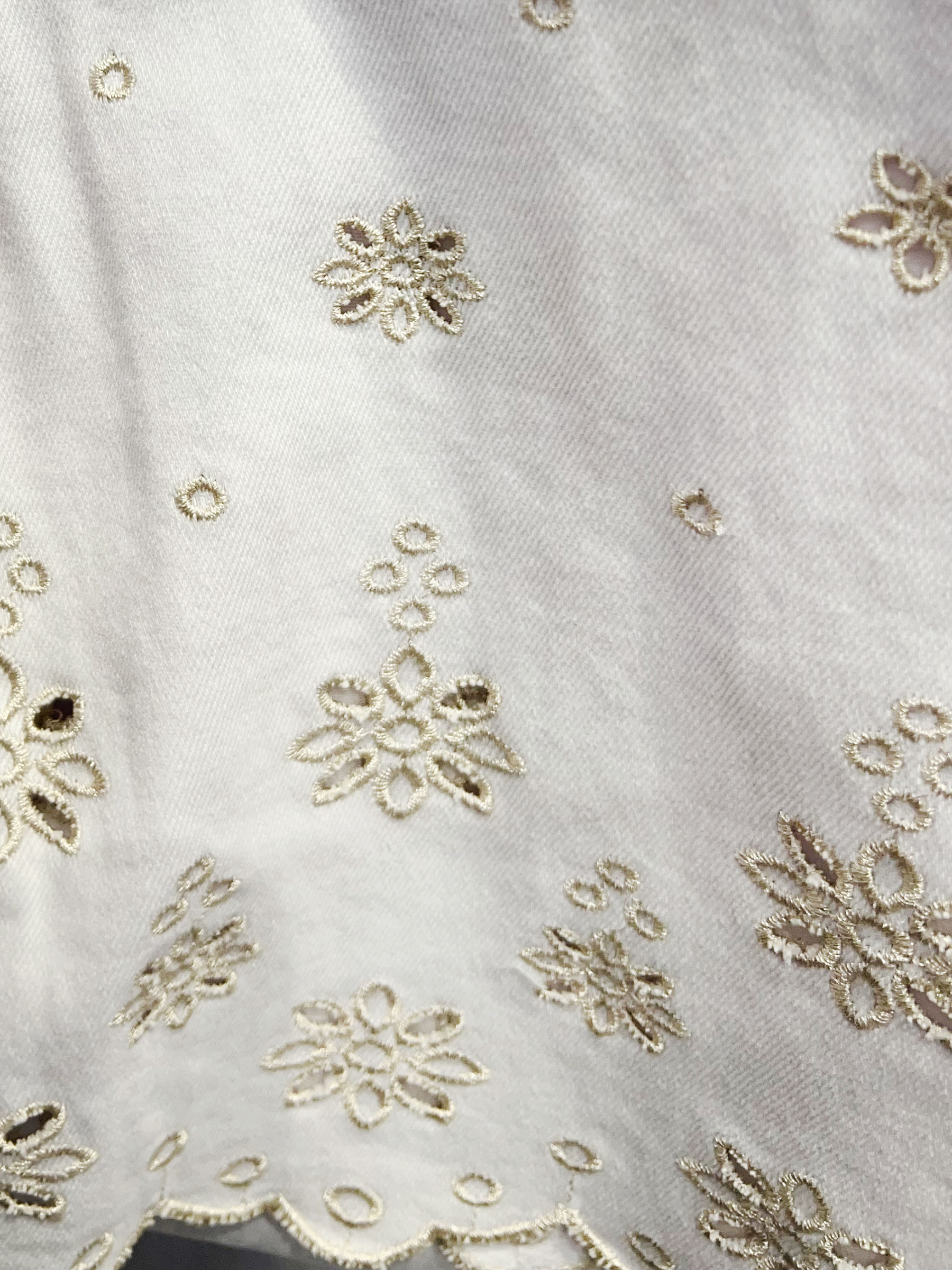 Jeans blancos. Detalle calado floral en el bajo. Tiro alto. Cinco bolsillos. Cierre frontal con cremallera y botón metálico. Tiro 26 cm. Largo 94 cm. Bajo 24 cm.