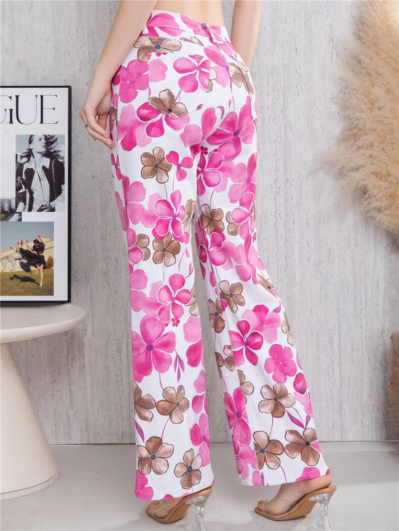 Pantalón recto. Estampado floral en contraste. Cinco bolsillos. Cierre frontal con cremallera y botón metálico. Tiro 26 cm. Largo 102 cm. Bajo 26 cm.