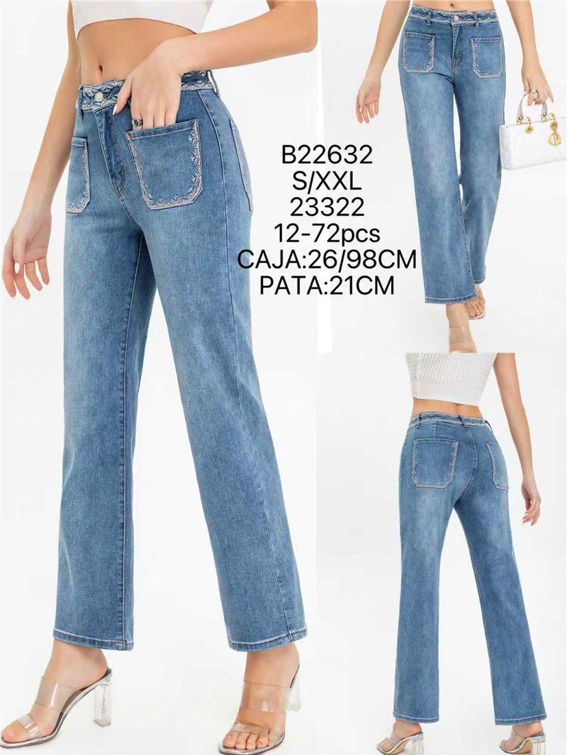 Pantalón vaquero recto. Bolsillos de parche delanteros y traseros con detalle bordados. Cinturilla decorativa. Tiro 26 cm. Largo 98 cm. Bajo 21 cm. Cierre frontal con cremallera y botón metálico.