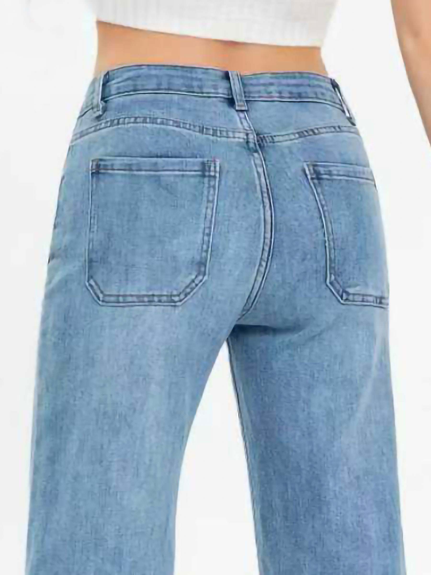 Pantalón vaquero ancho. Bolsillos delanteros de parche. Bajo deshilachado. Cierre frontal con cremallera y botón metálico. Tiro 26 cm. Largo 98 cm. Bajo 26 cm.