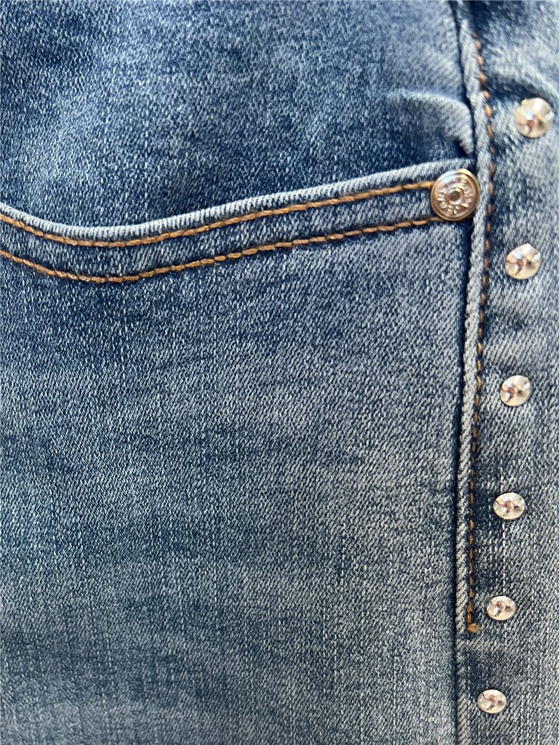 Pantalón vaquero culotte. Tiro alto. Pierna ancha. Detalle tachuelas laterales. Estrella con tachas en bolsillo trasero. Cinco bolsillos. Cierre frontal con cremallera y botón metálico. Tiro 27 cm. Largo 80 cm. Bajo 26 cm.