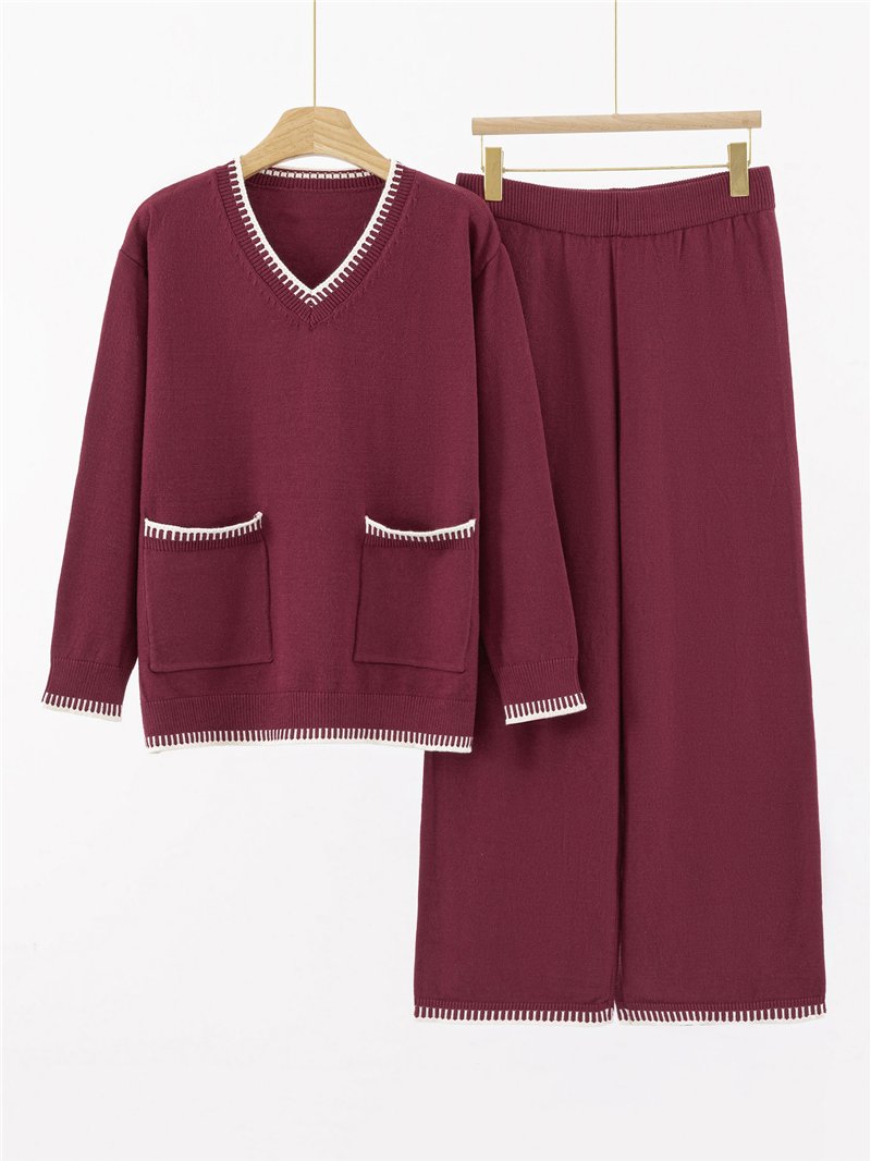 Jersey amplio de punto. Cuello pico. Bolsillos delanteros de plastrón. Manga larga. Pantalón recto con cintura elástica y bolsillos laterales.