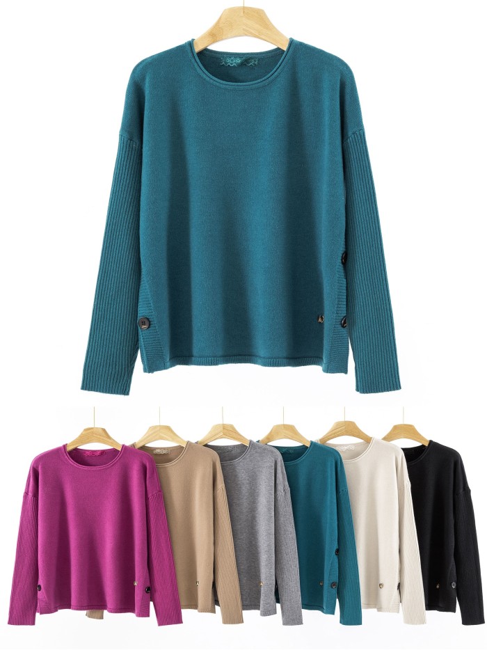 Jersey amplio. Detalle botones en los laterales. Acabados en rib. Cuello redondo. Manga larga.