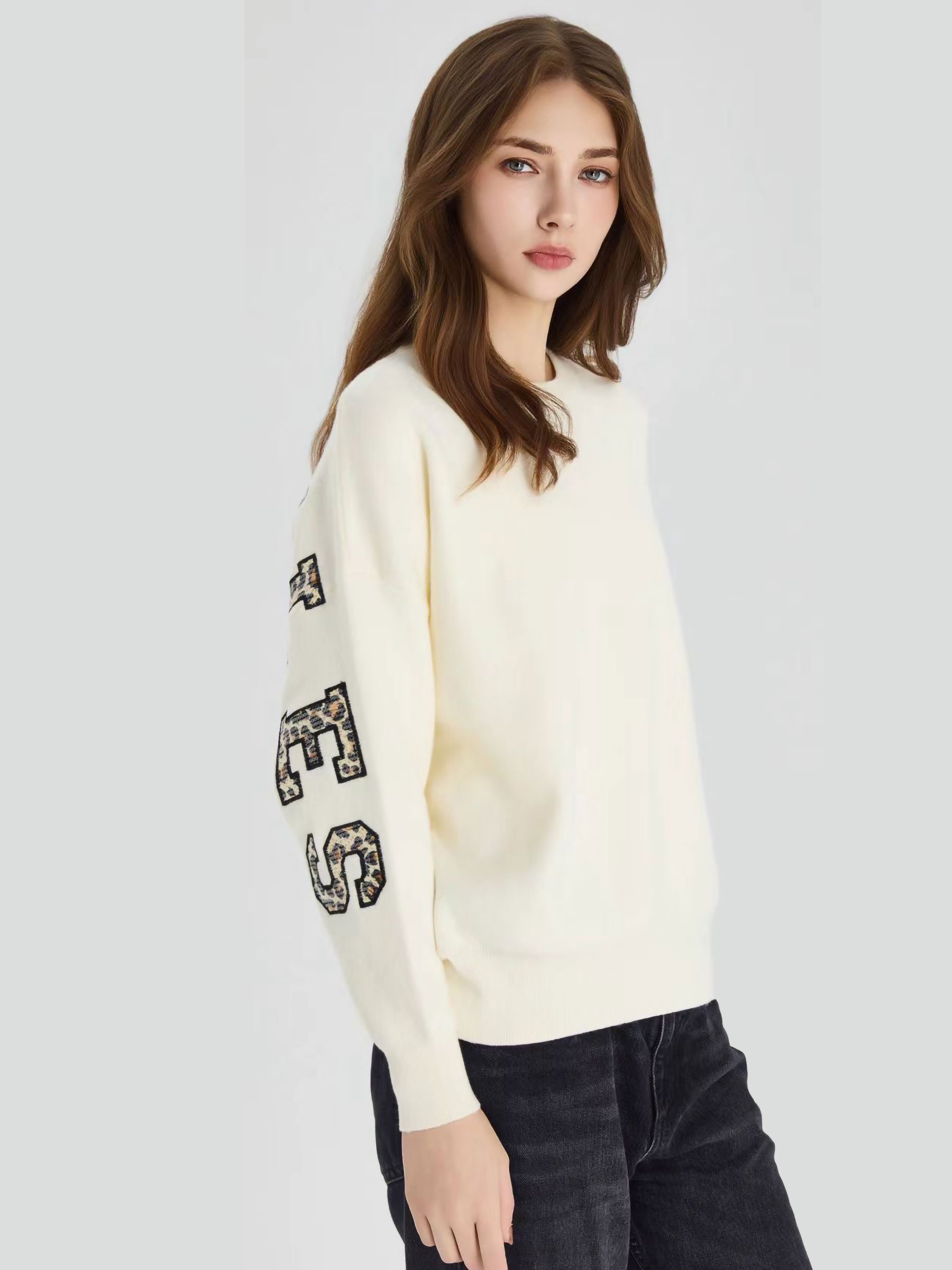 Jersey de punto. Cuello redondo. Detalle texto con lentejuelas. Manga larga.