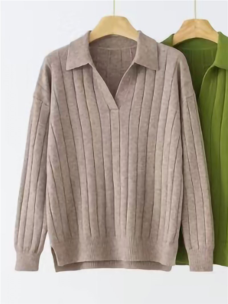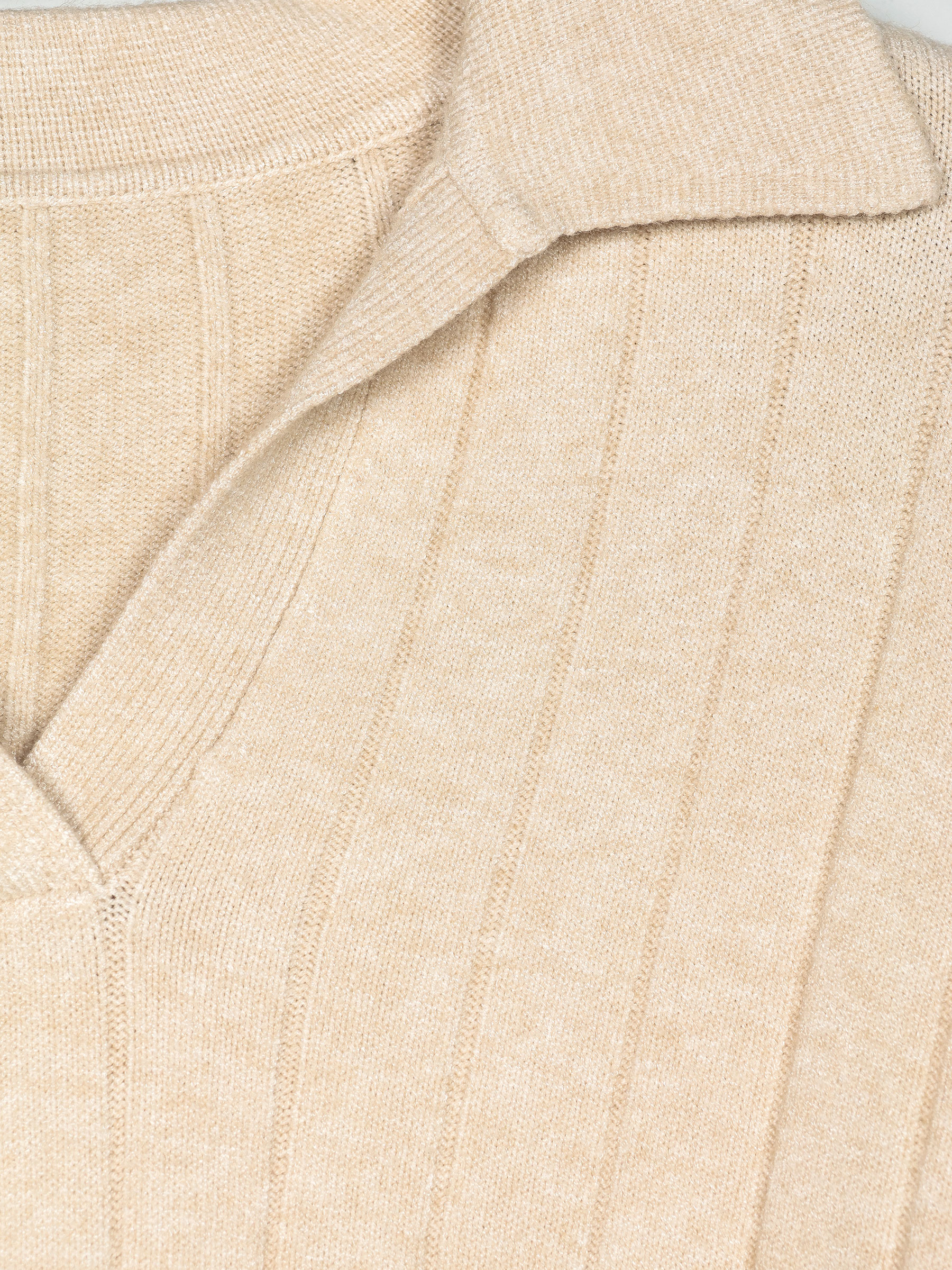 Jersey canalé. Punto soft. Bajo con aberturas laterales. Acabados en rib. Cuello polo. Manga larga.