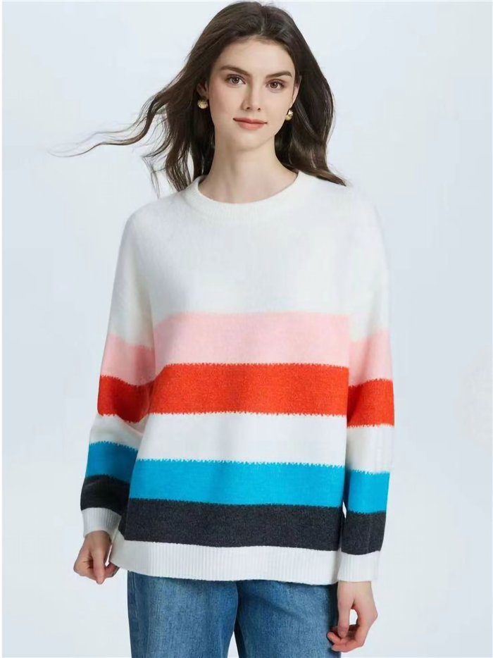 Jersey de punto suave con rayas anchas multicolor y cuello redondo.
