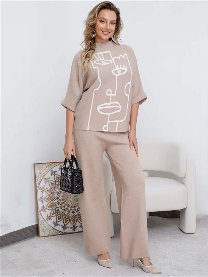 Conjunto punto 2 piezas. Jersey con diseño de rostro abstracto y pantalón ancho a juego.