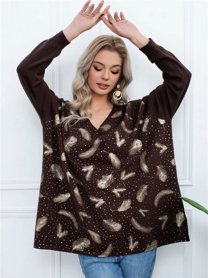 Jersey de punto talla grande. Estampado de plumas y cuello en V.