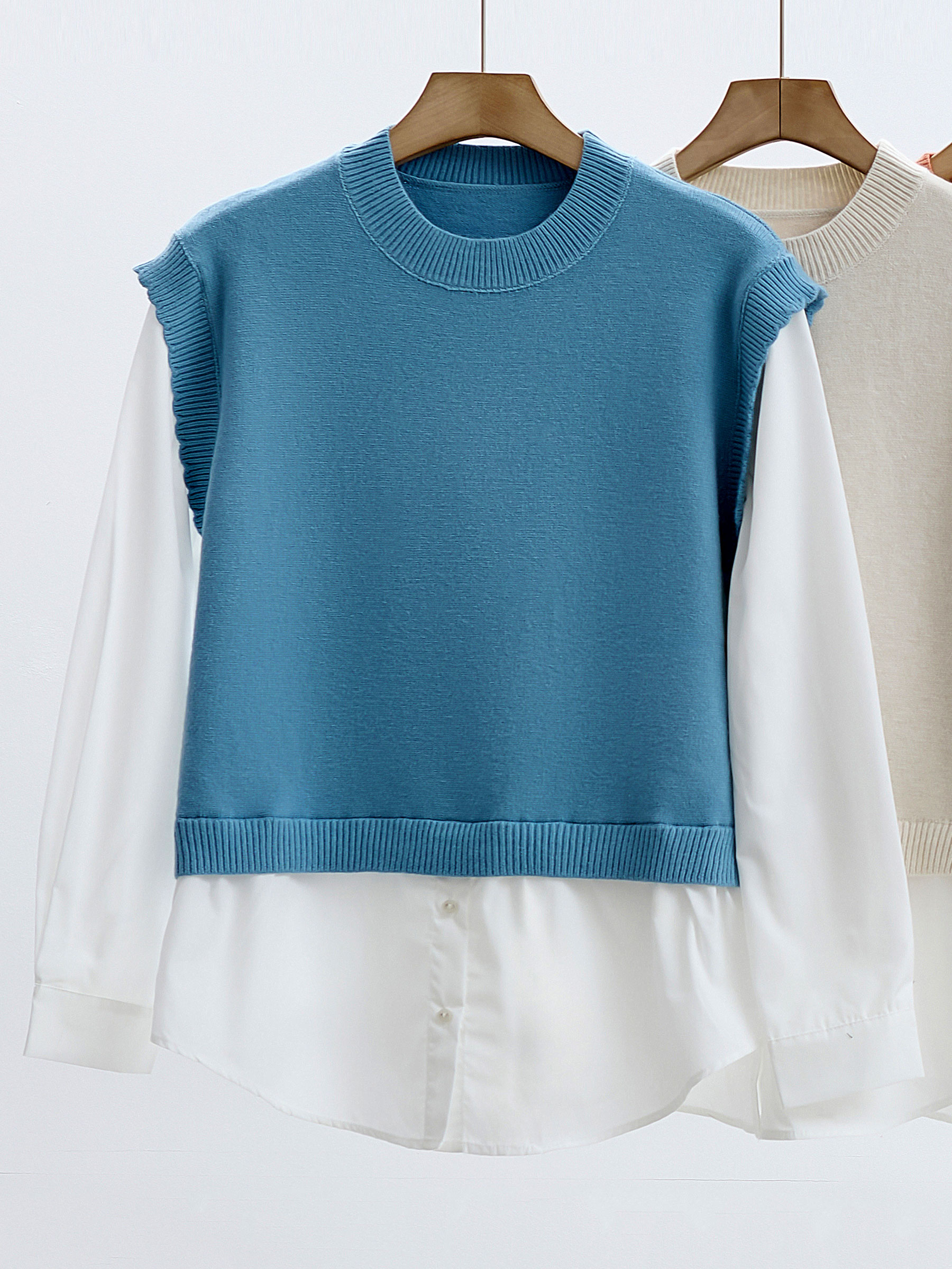 Jersey combinado. Efecto blusa. Cuello redondo. Manga larga.
