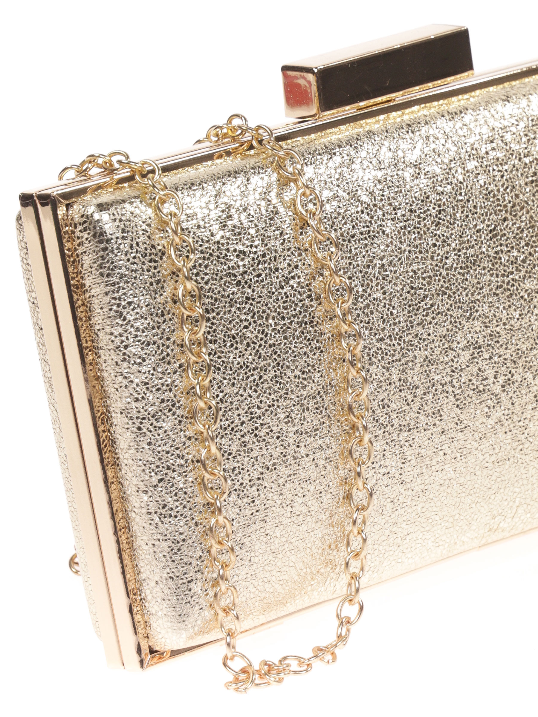 Bolso de fiesta. Material polipiel. Efecto metalizado. Asa de hombro en cadena. Forro sin bolsillo interior. Cierre metálico dorado.