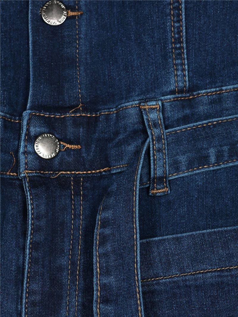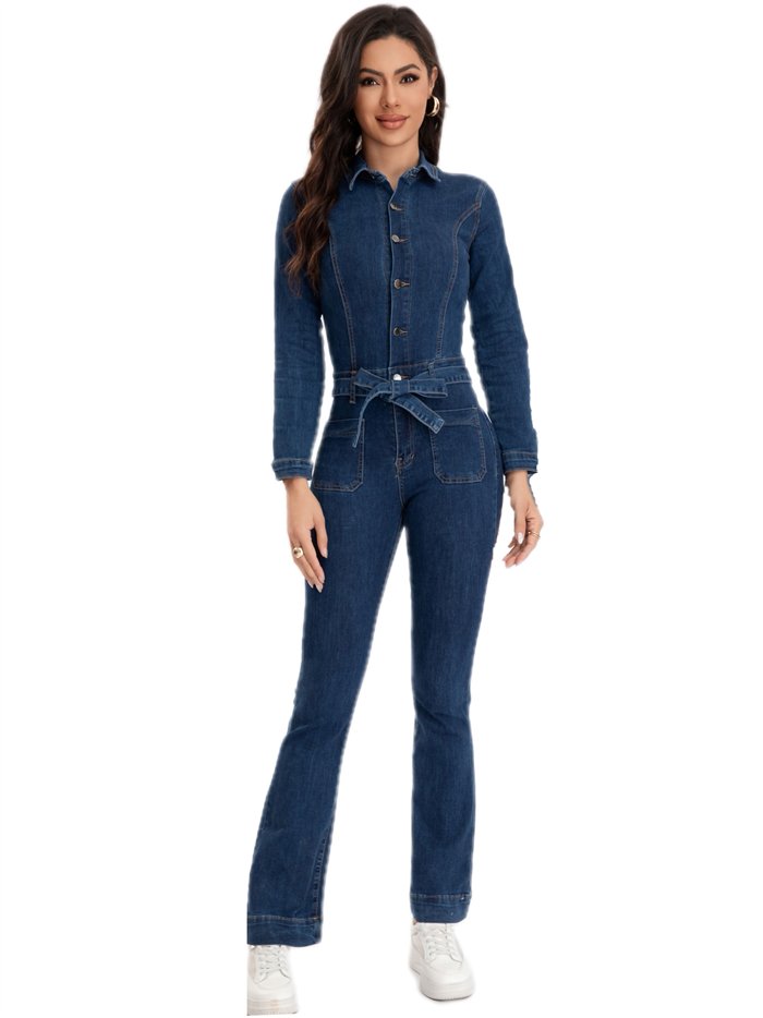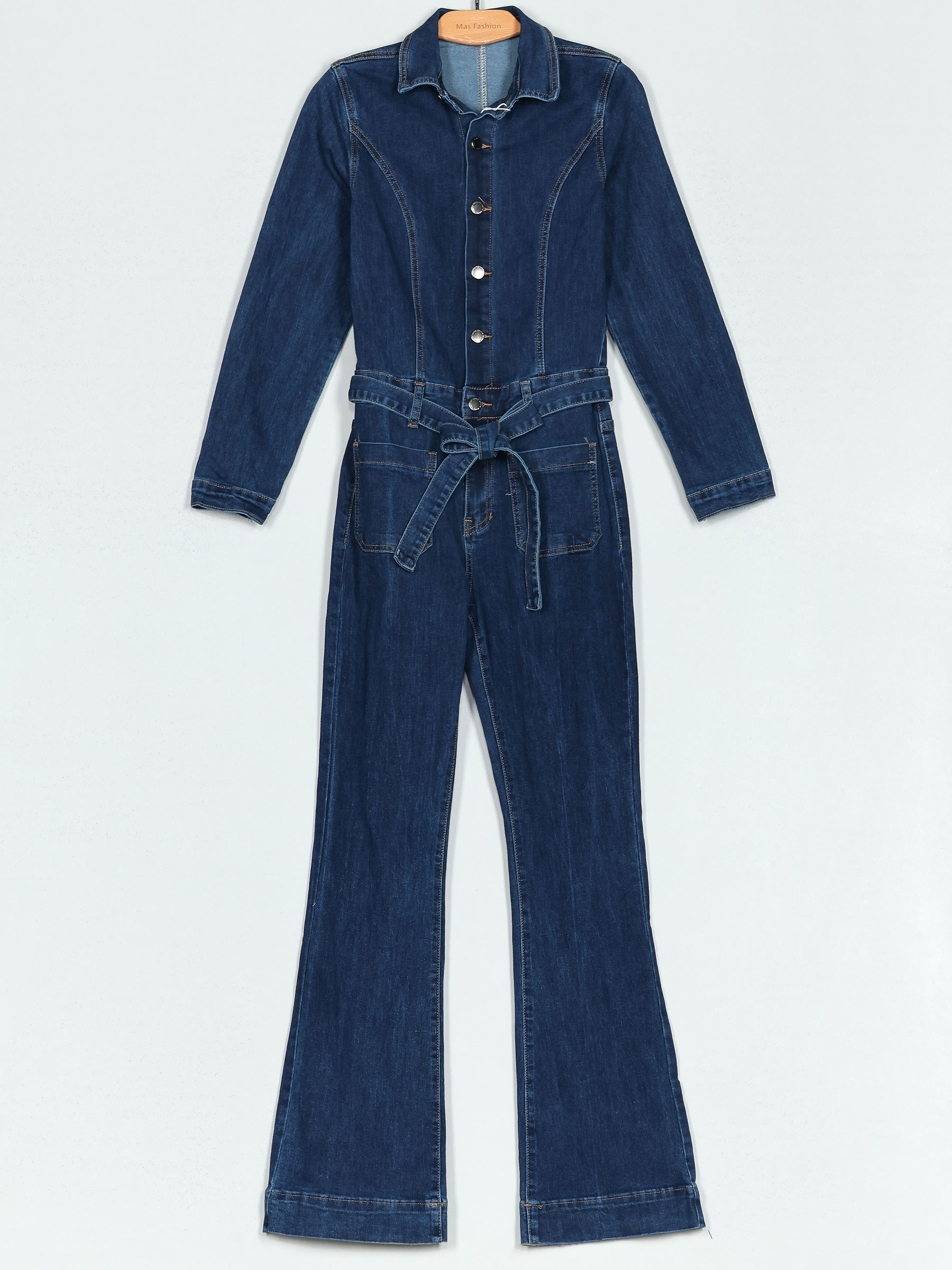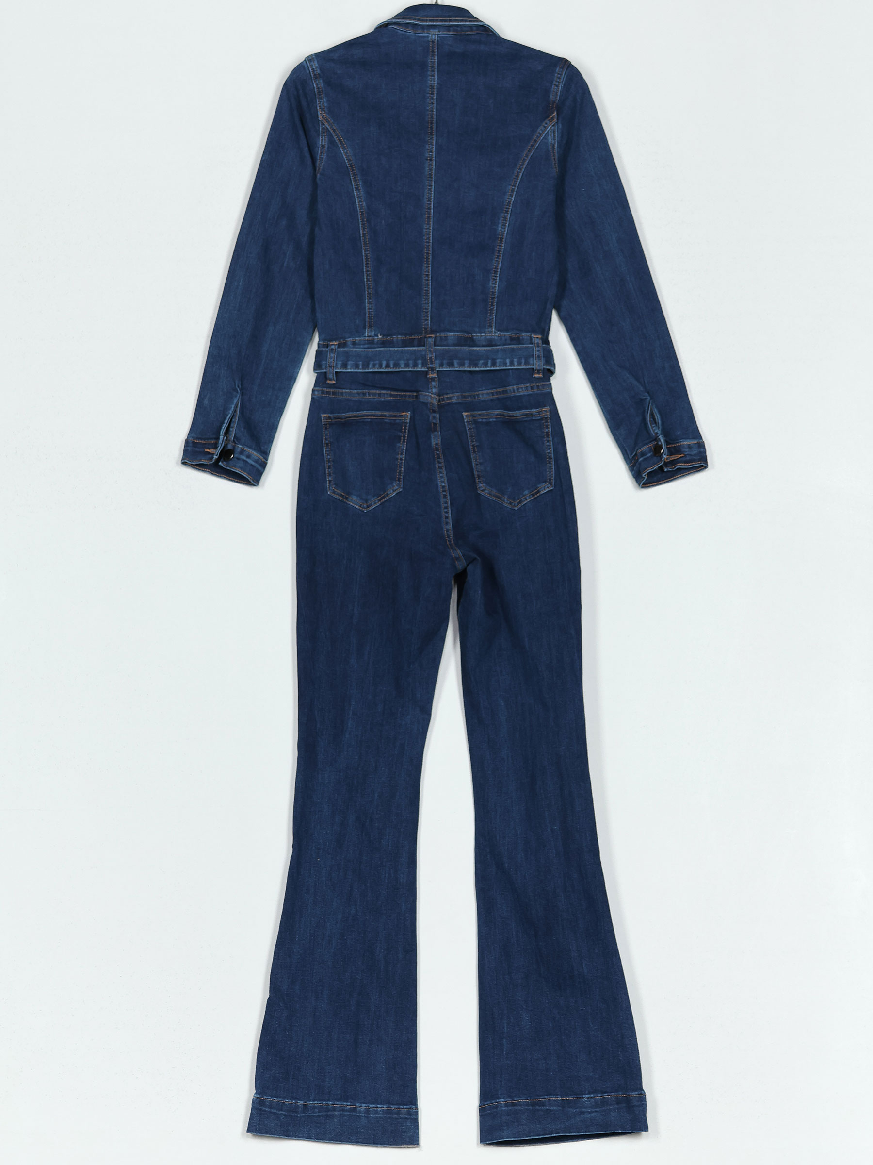 Mono largo denim flare. Cinturón del mismo tejido. Cuello solapa. Manga larga. Cierre frontal con cremallera y botones.