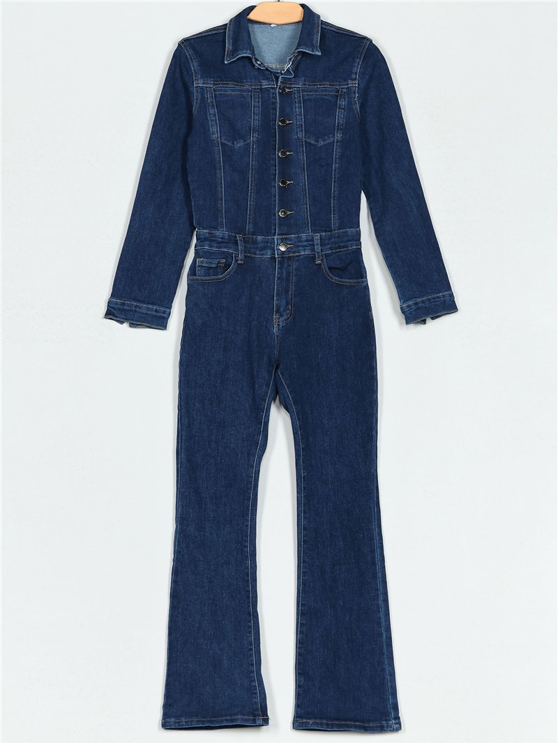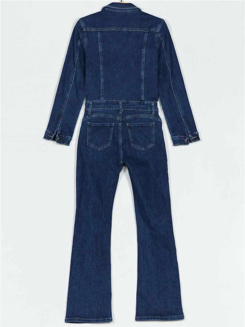 Mono largo denim flare. Cuello solapa. Manga larga. Cierre frontal con cremallera y botones.