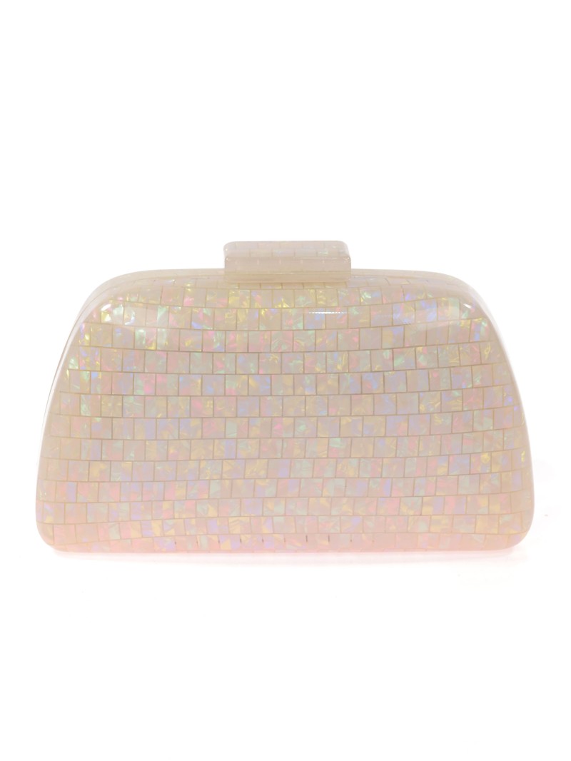 Bolso de fiesta. Material símil nácar. Asa de hombro en cadena. Forro sin bolsillo interior. Cierre mediante imán.