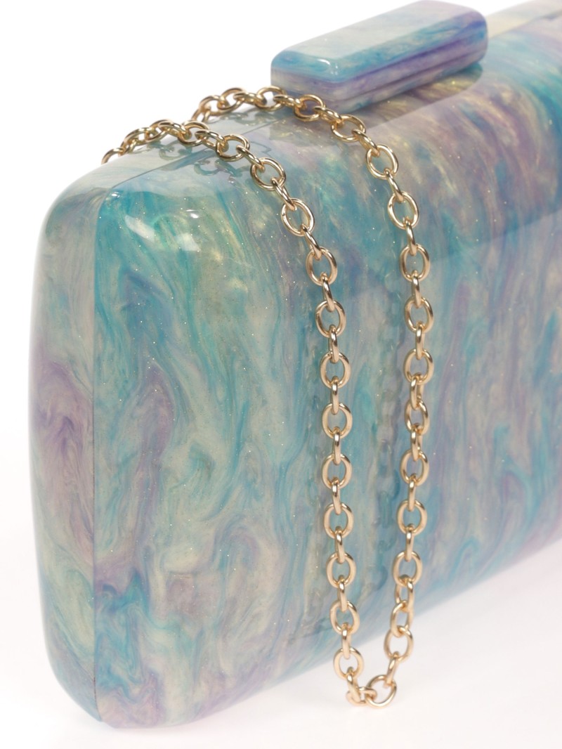 Bolso de fiesta. Material símil nácar. Asa de hombro en cadena. Forro sin bolsillo interior. Cierre mediante imán.