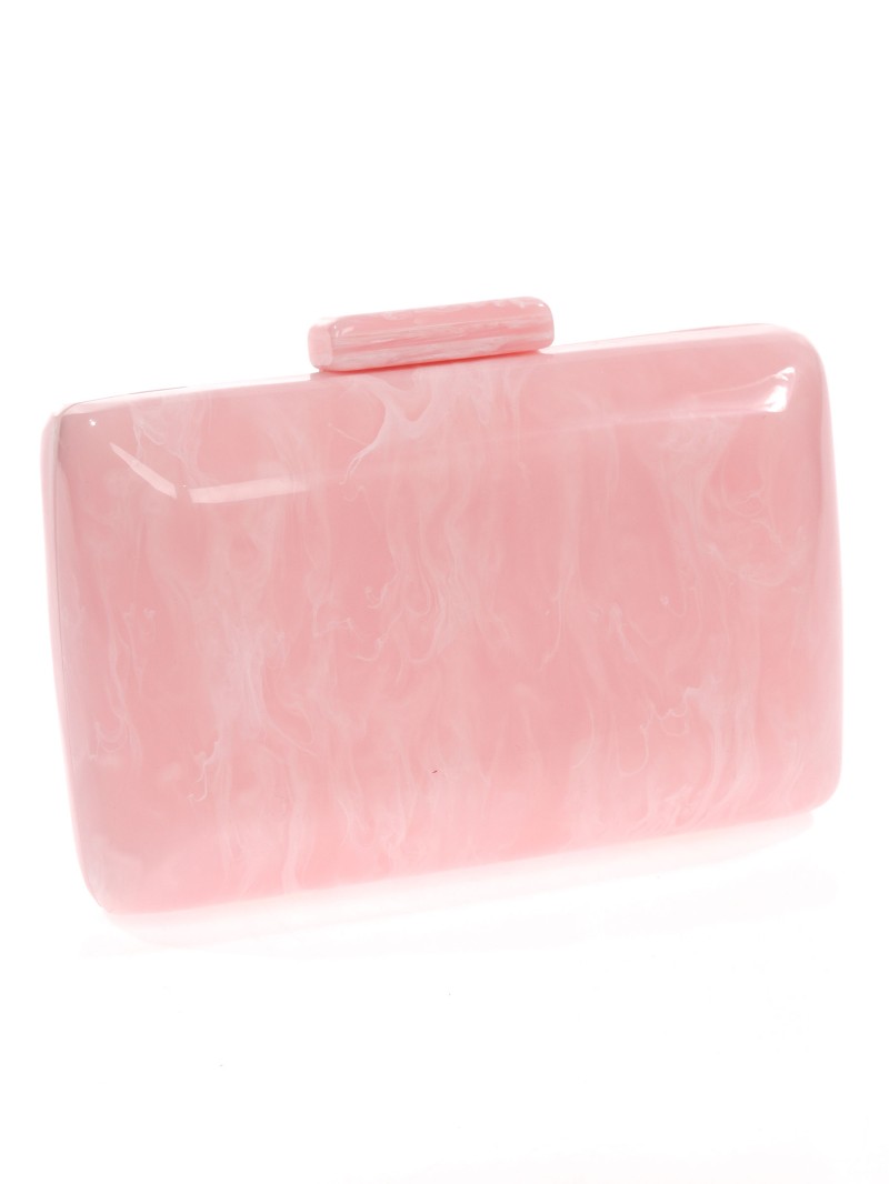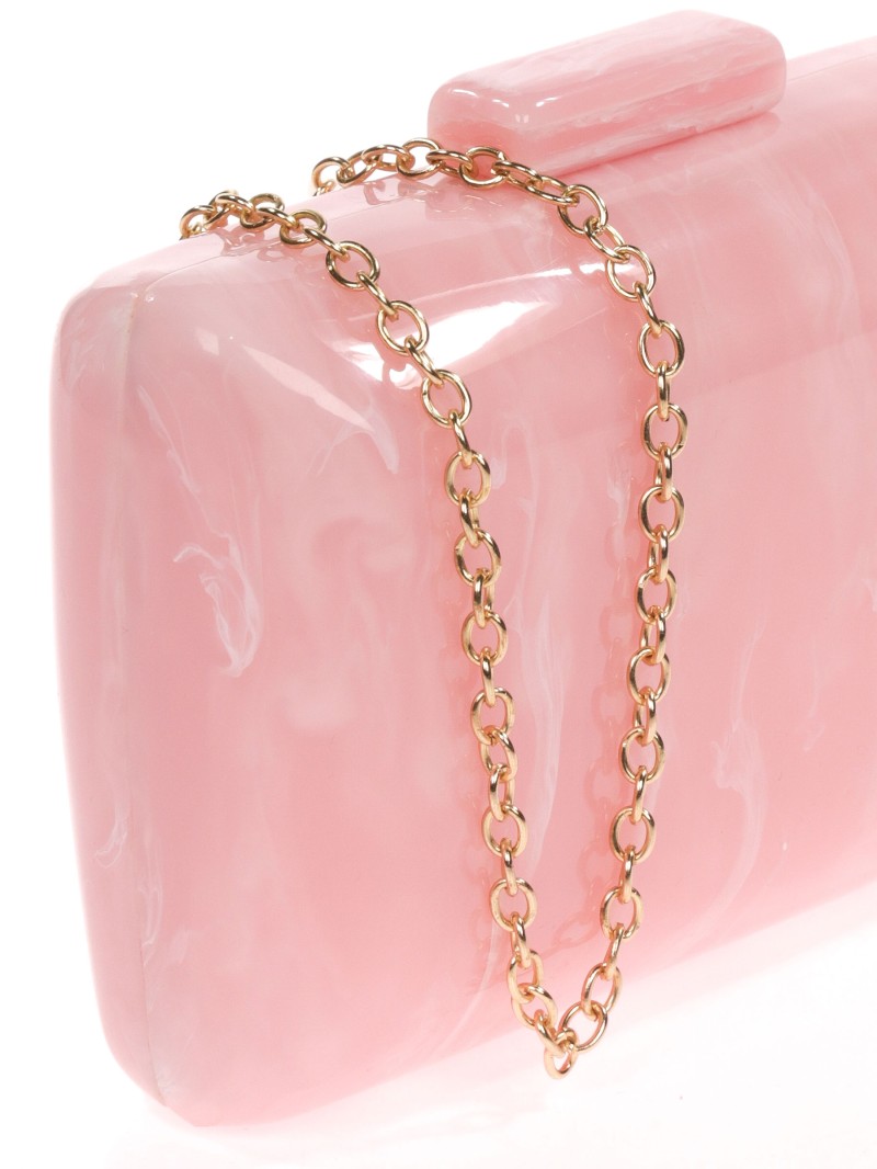 Bolso de fiesta. Material símil nácar. Asa de hombro en cadena. Forro sin bolsillo interior. Cierre mediante imán.