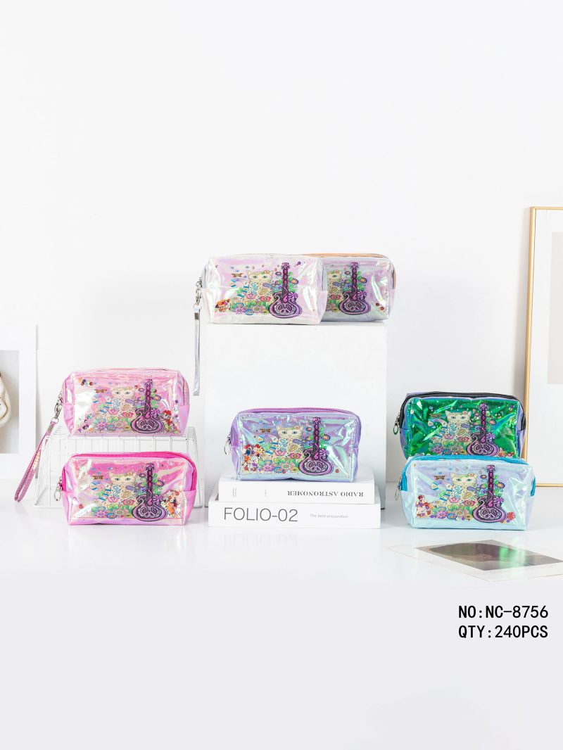 Estuche neceser holográfico de gatito y guitarra.