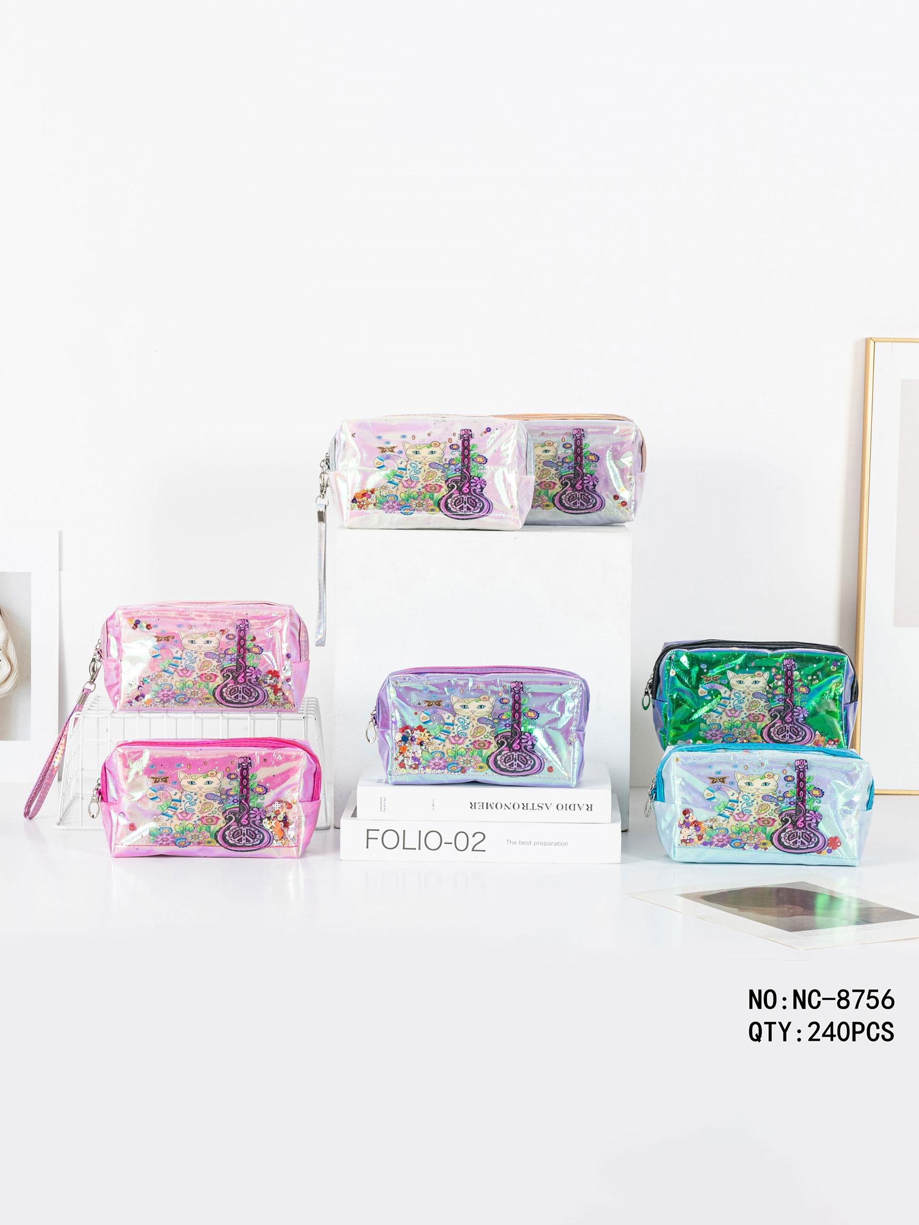 Estuche neceser holográfico de gatito y guitarra
