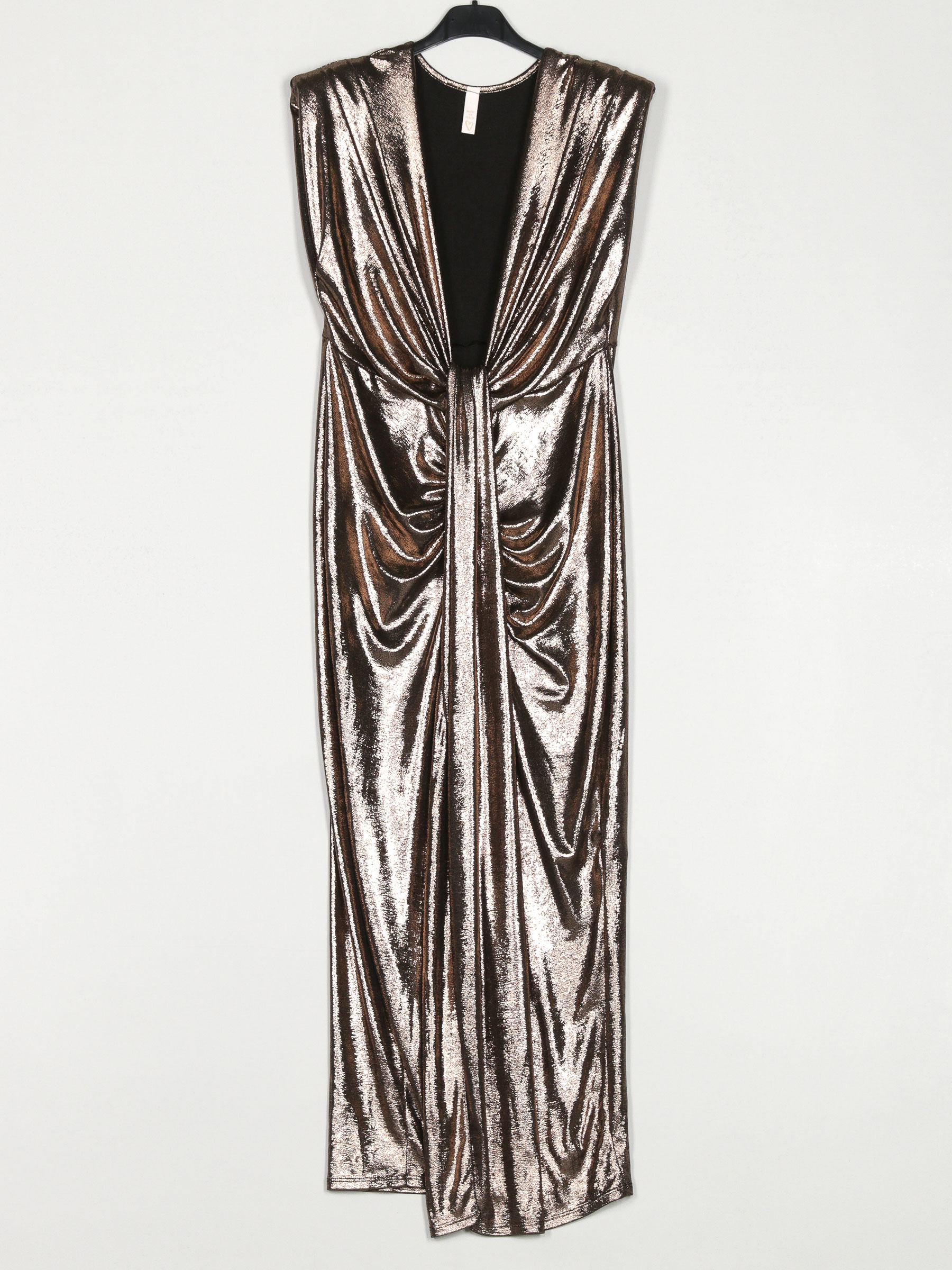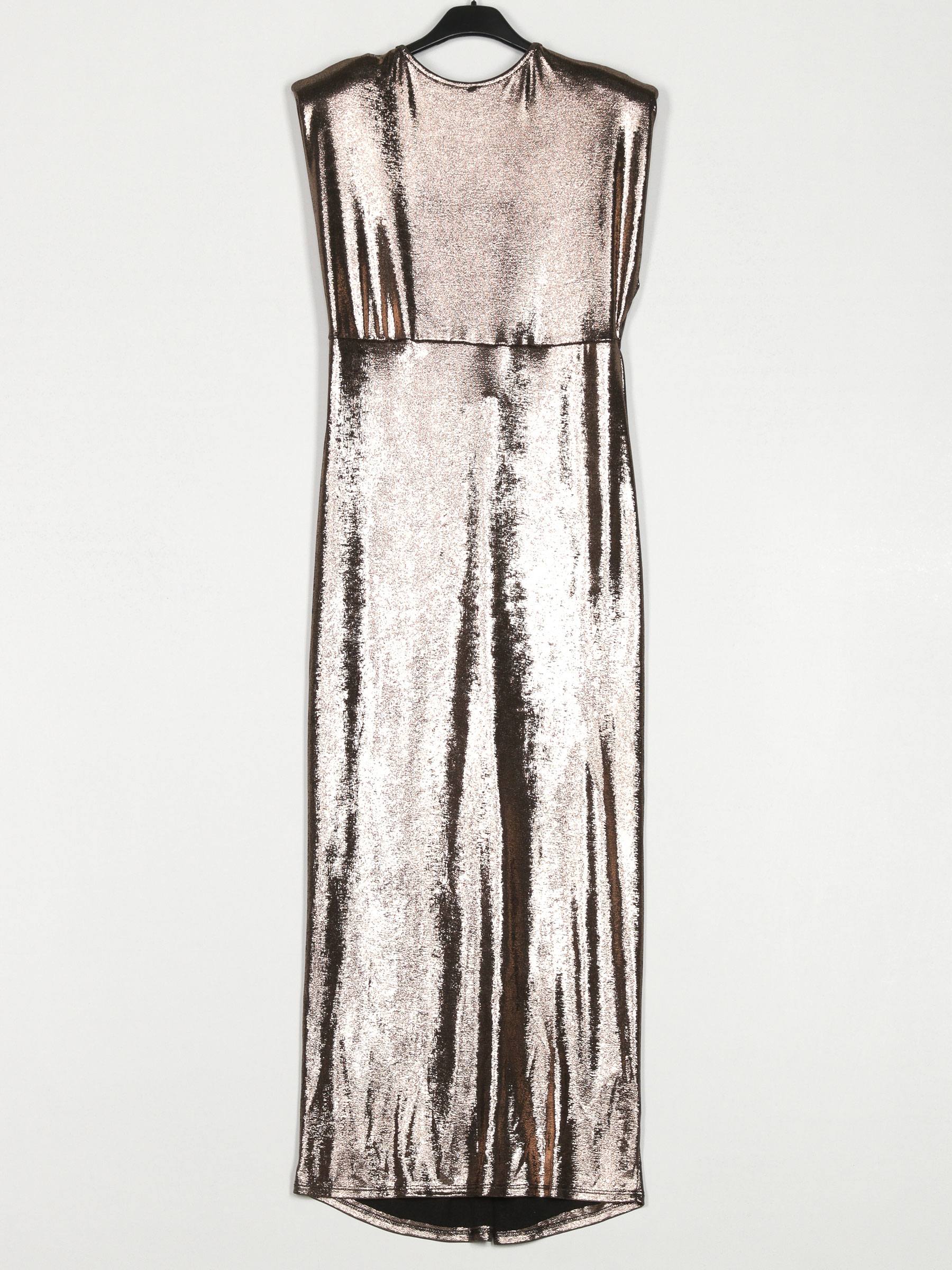 Vestido fiesta metalizado con hombreras. Detalle nudos. Tejido elástico. Abertura delantera. Manga sisa.