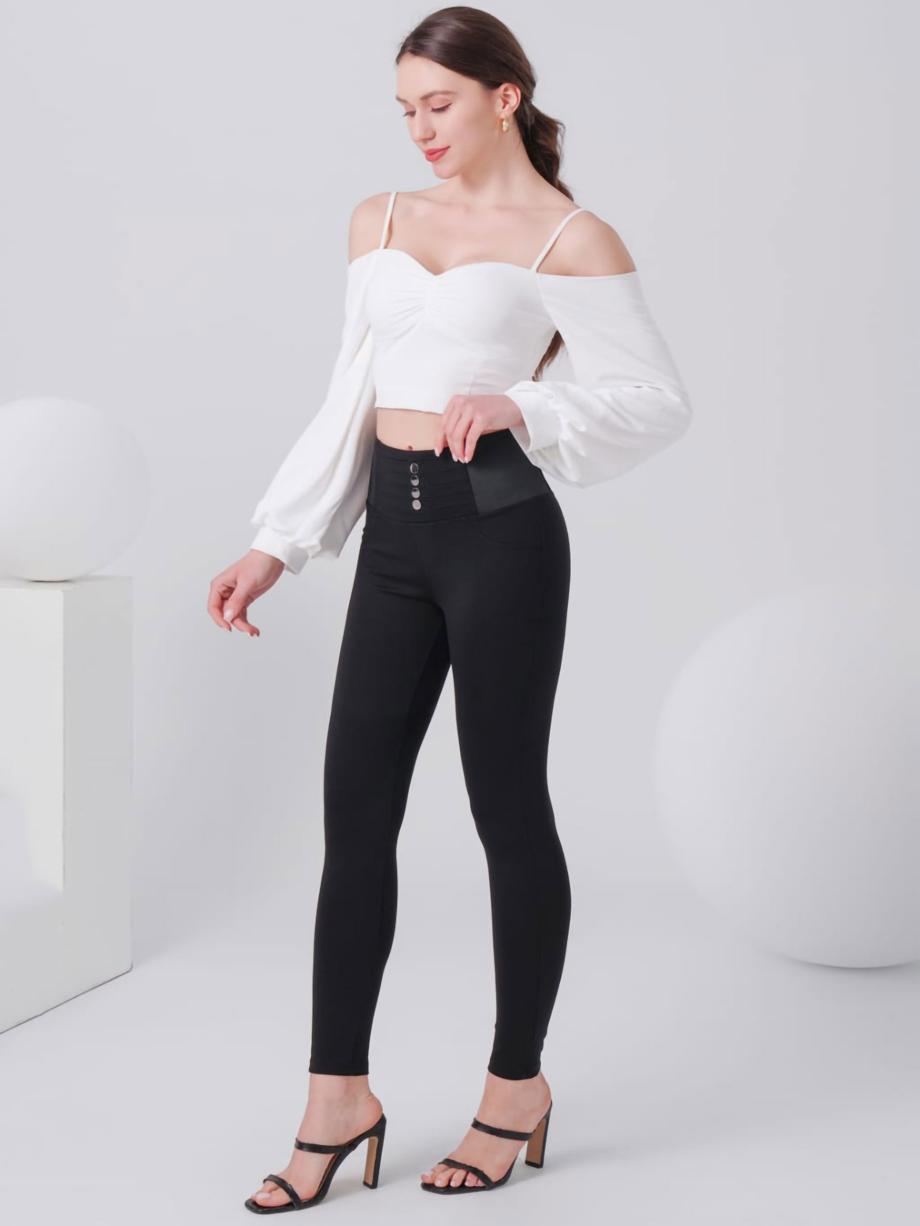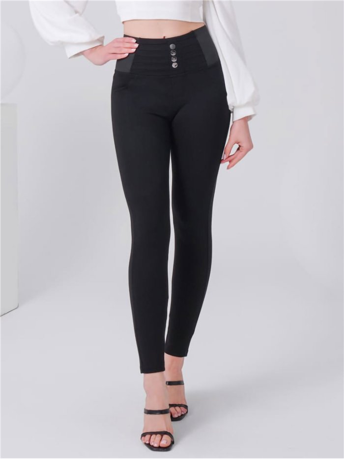 Pantalón skinny de punto roma. Detalle de botones y banda combinada a tono. Tiro alto. Cintura elástica.