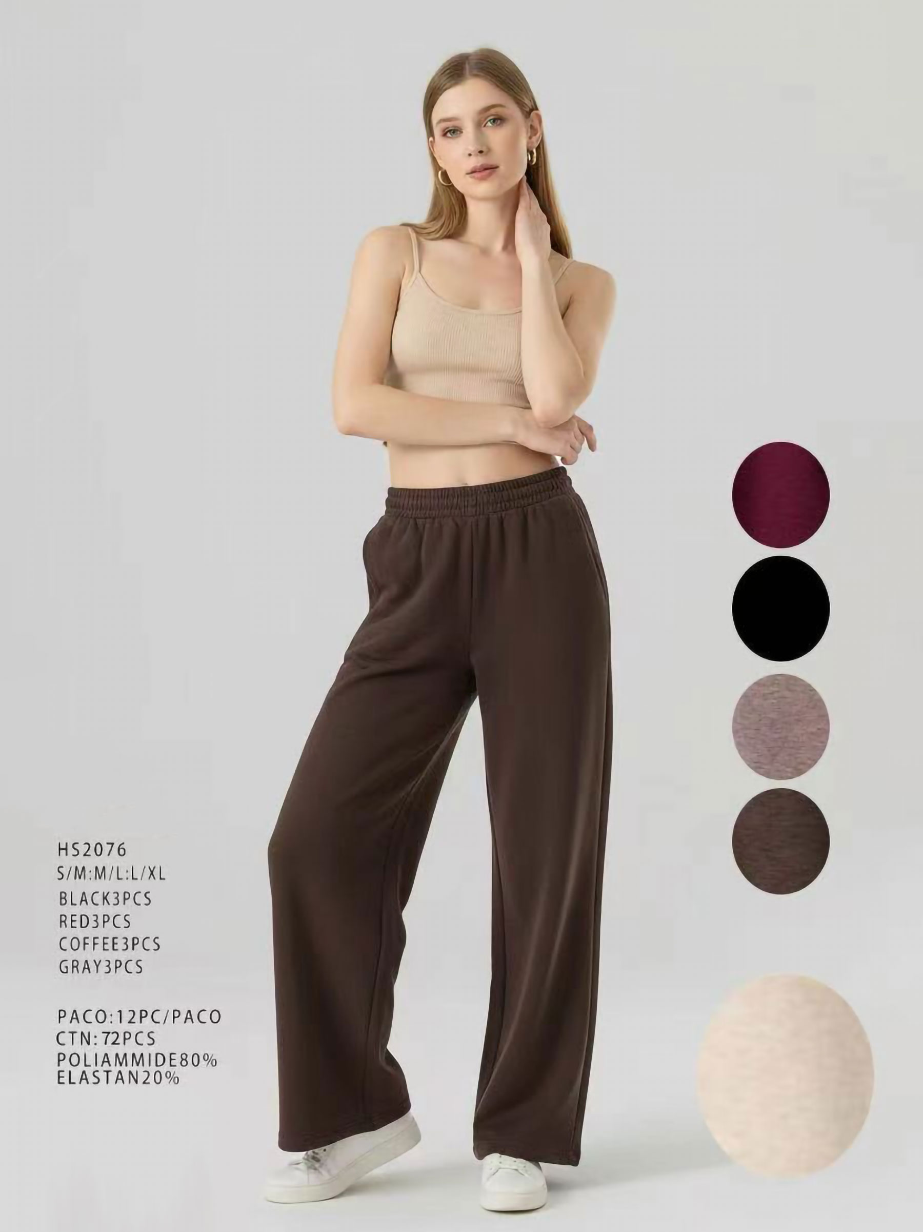 Pantalón recto afelpado. Tiro alto y pernera ancha, con cintura elástica. Suave y cómodo.