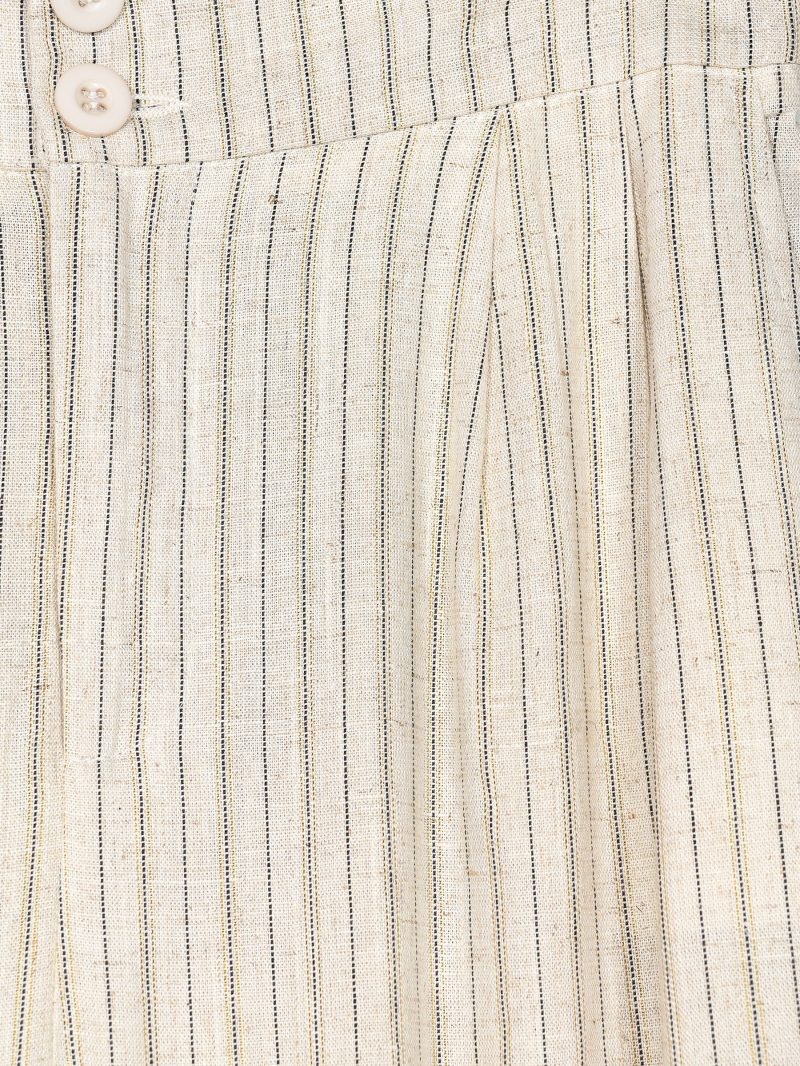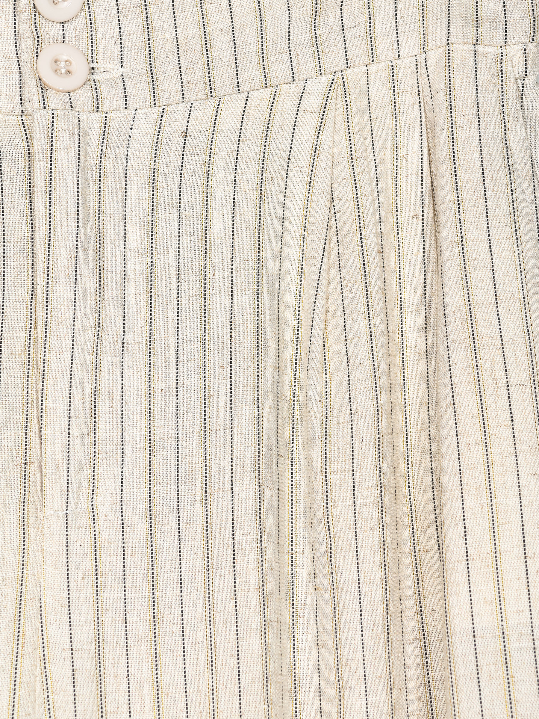 Pantalón de efecto lino rayas. Tiro alto. Pernera ancha. Cintura con botón. Bolsillos laterales.