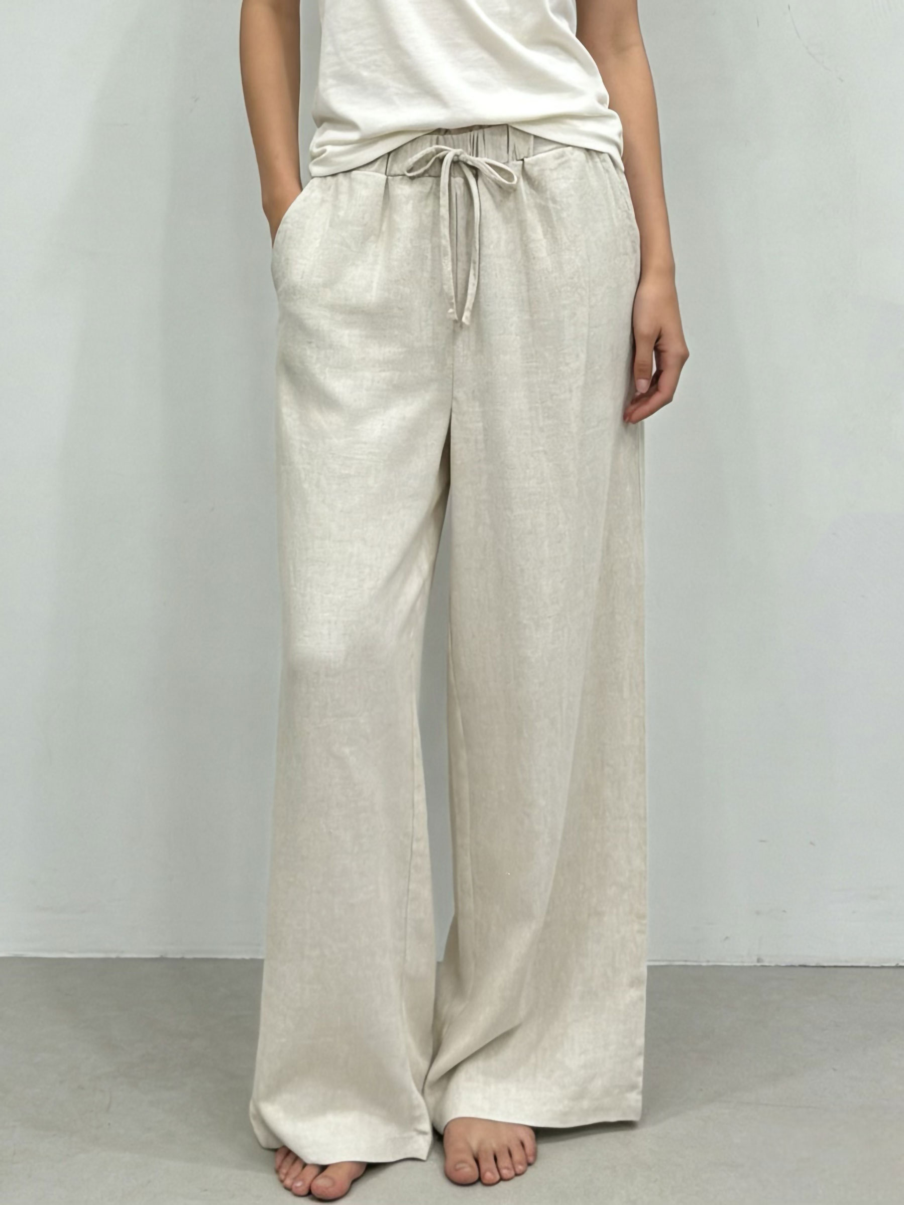 Pantalón wide leg efecto lino. Cintura elástica y cordón. Bolsillos laterales.