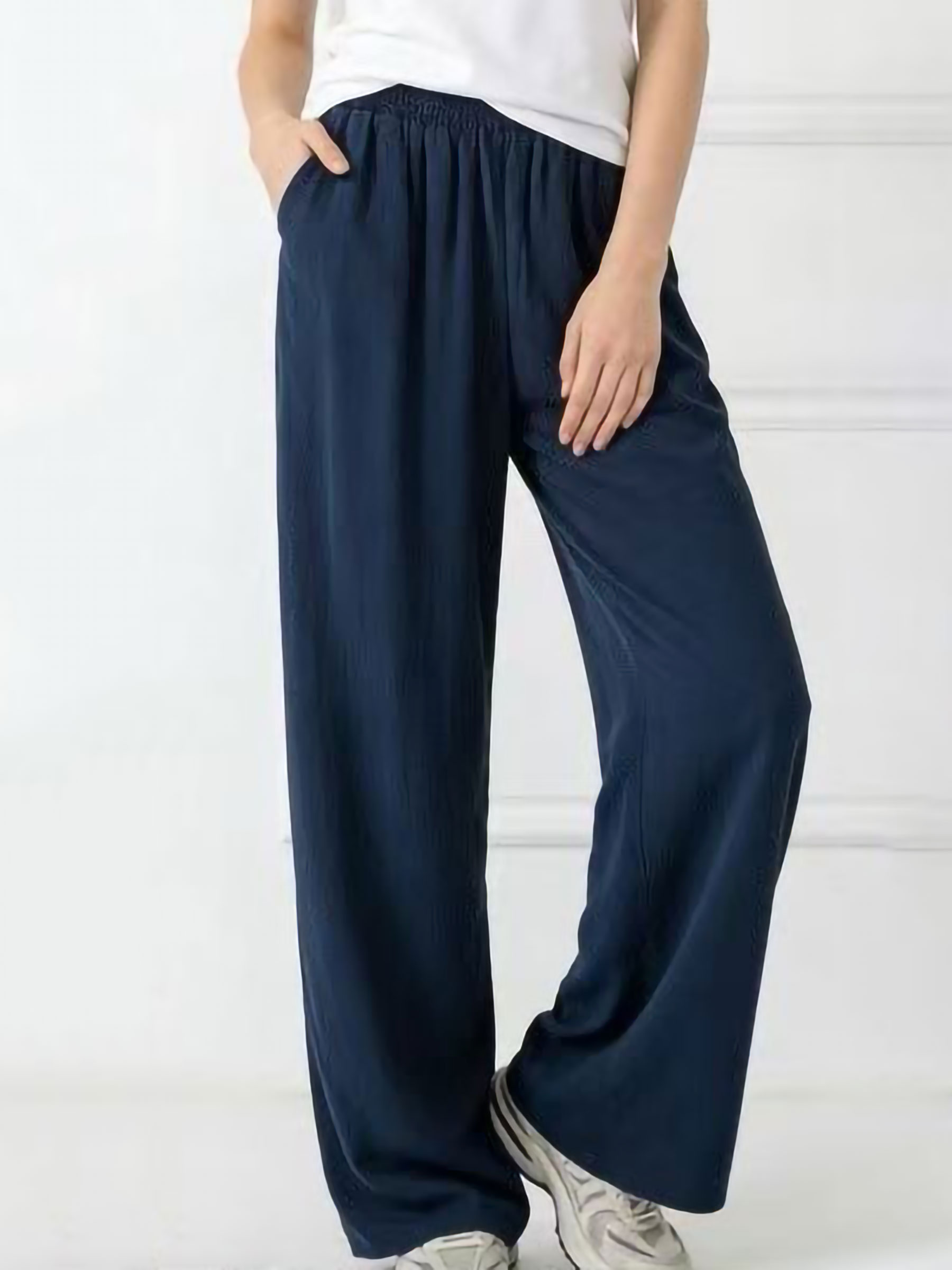 Pantalón palazzo. Cintura elástica cómoda. Pierna ancha y caída recta. Bolsillos laterales.