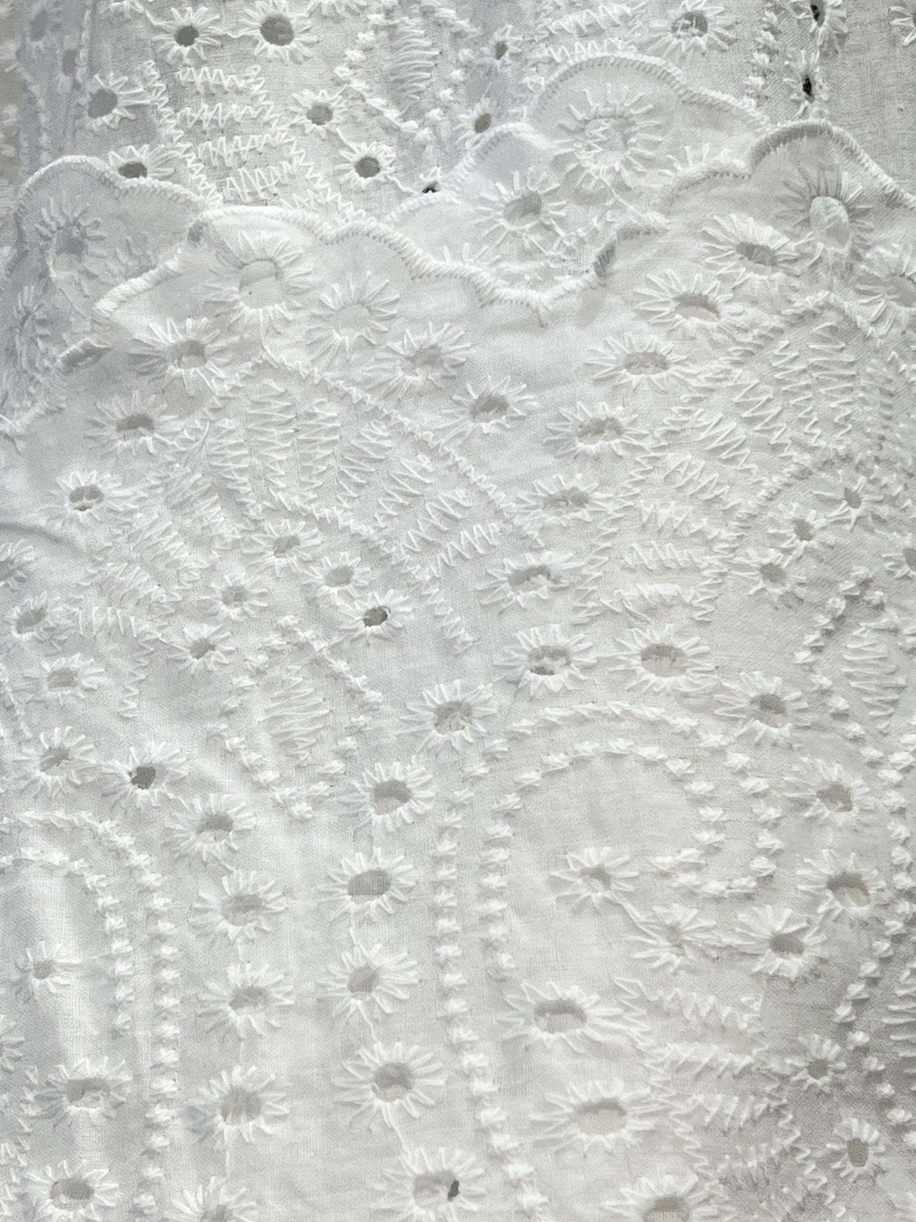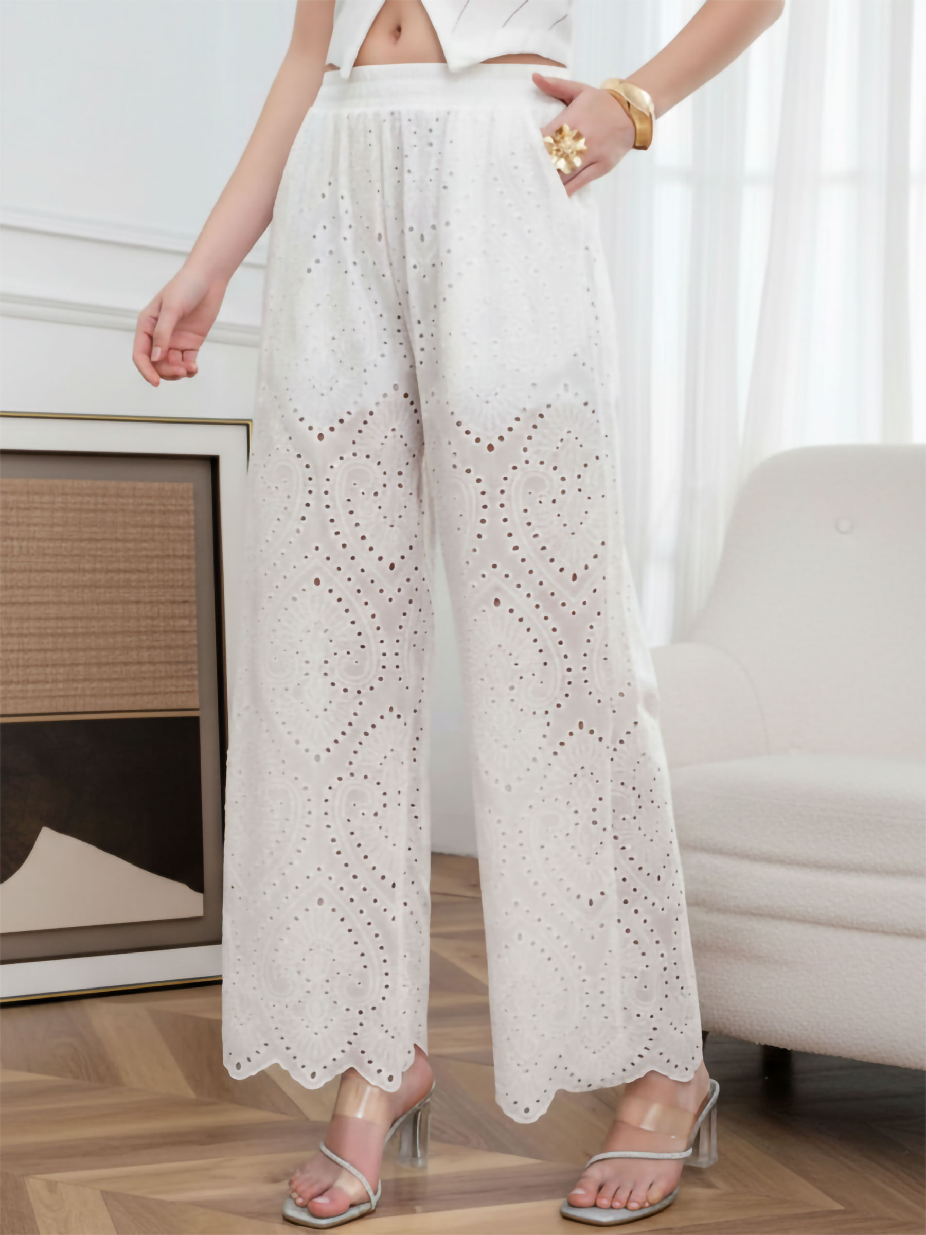 Pantalón recto. Bordado perforado. Cintura elástica. Pierna ancha. Bajo festoneado.