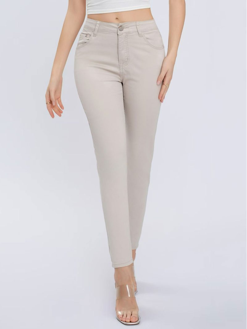 Pantalón elástico. Tiro alto. Cinco bolsillos. Cierre frontal con cremallera y botón.