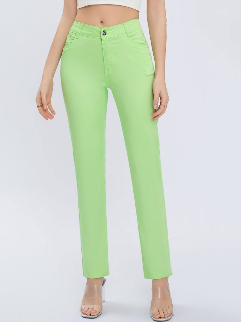 Pantalón elástico. Tiro alto. Cinco bolsillos. Cierre frontal con cremallera y botón.