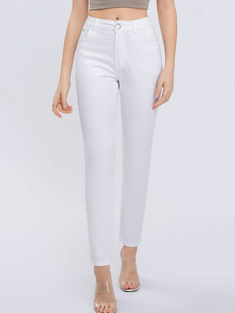 Pantalón elástico. Tiro alto. Cinco bolsillos. Cierre frontal con cremallera y botón.