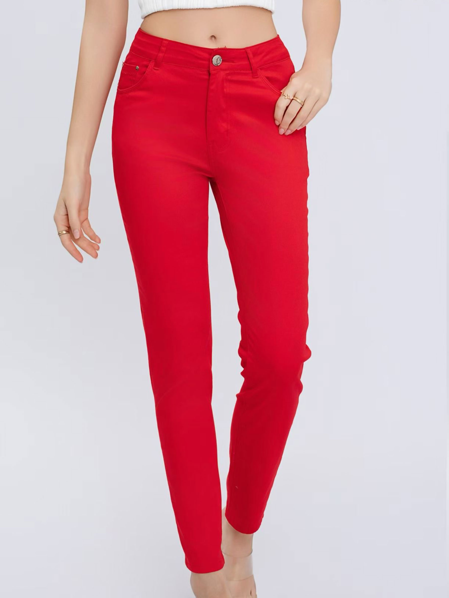Pantalón elástico. Tiro alto. Cinco bolsillos. Cierre frontal con cremallera y botón.