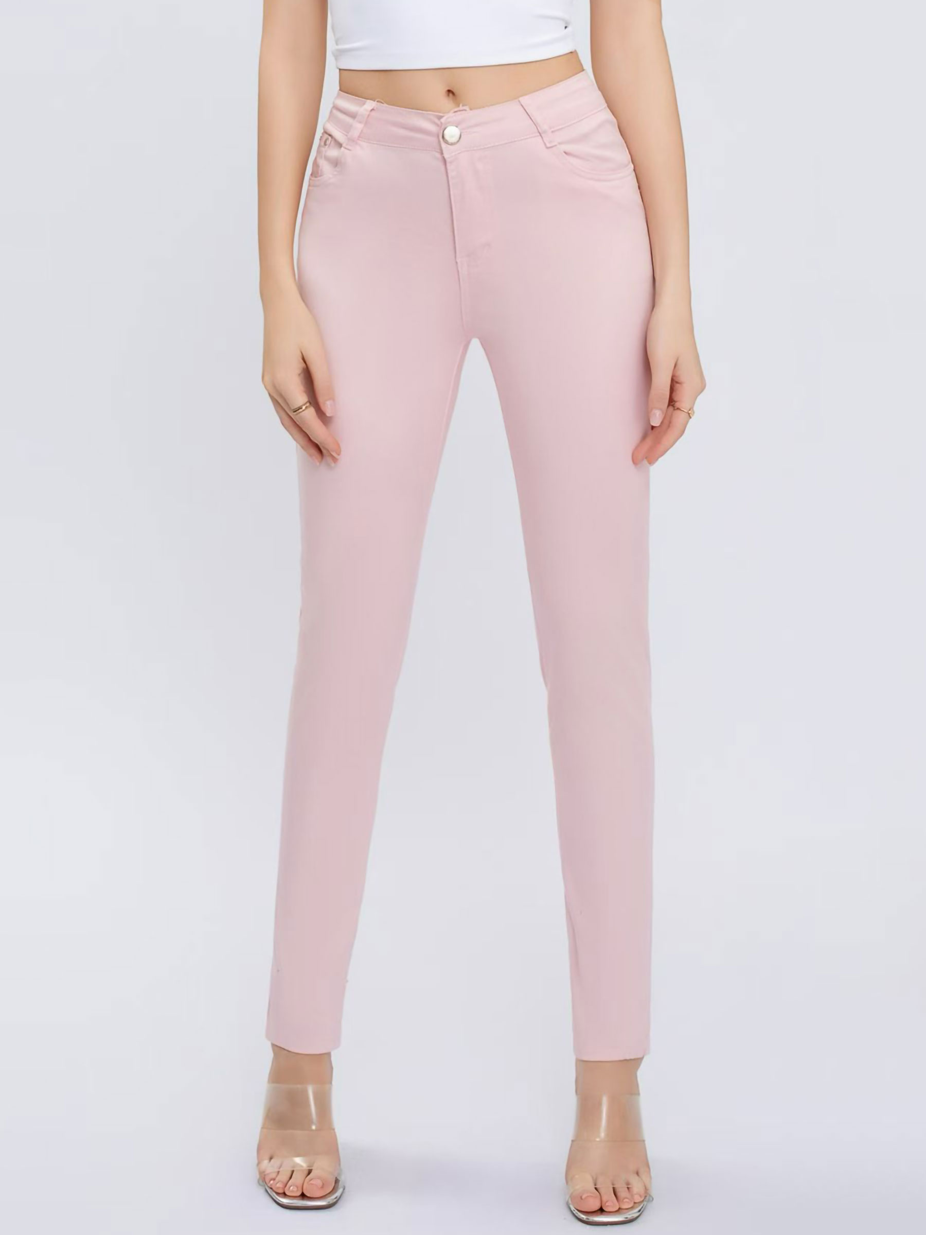 Pantalón elástico. Tiro alto. Cinco bolsillos. Cierre frontal con cremallera y botón.