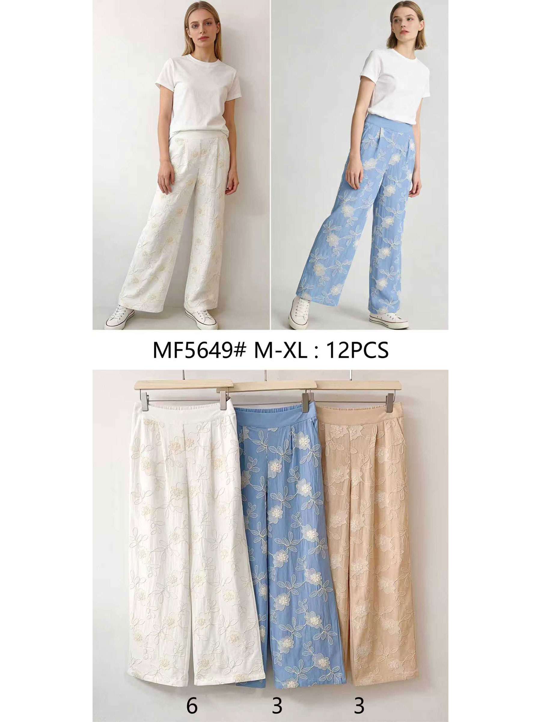 Mín. 6 Pantalones Pantalón lino bordado en el bajo DB-X5746 Pantalón efecto lino con cintura elástica. Corte recto/holgado y bajo con bordado decorativo. Ver precio