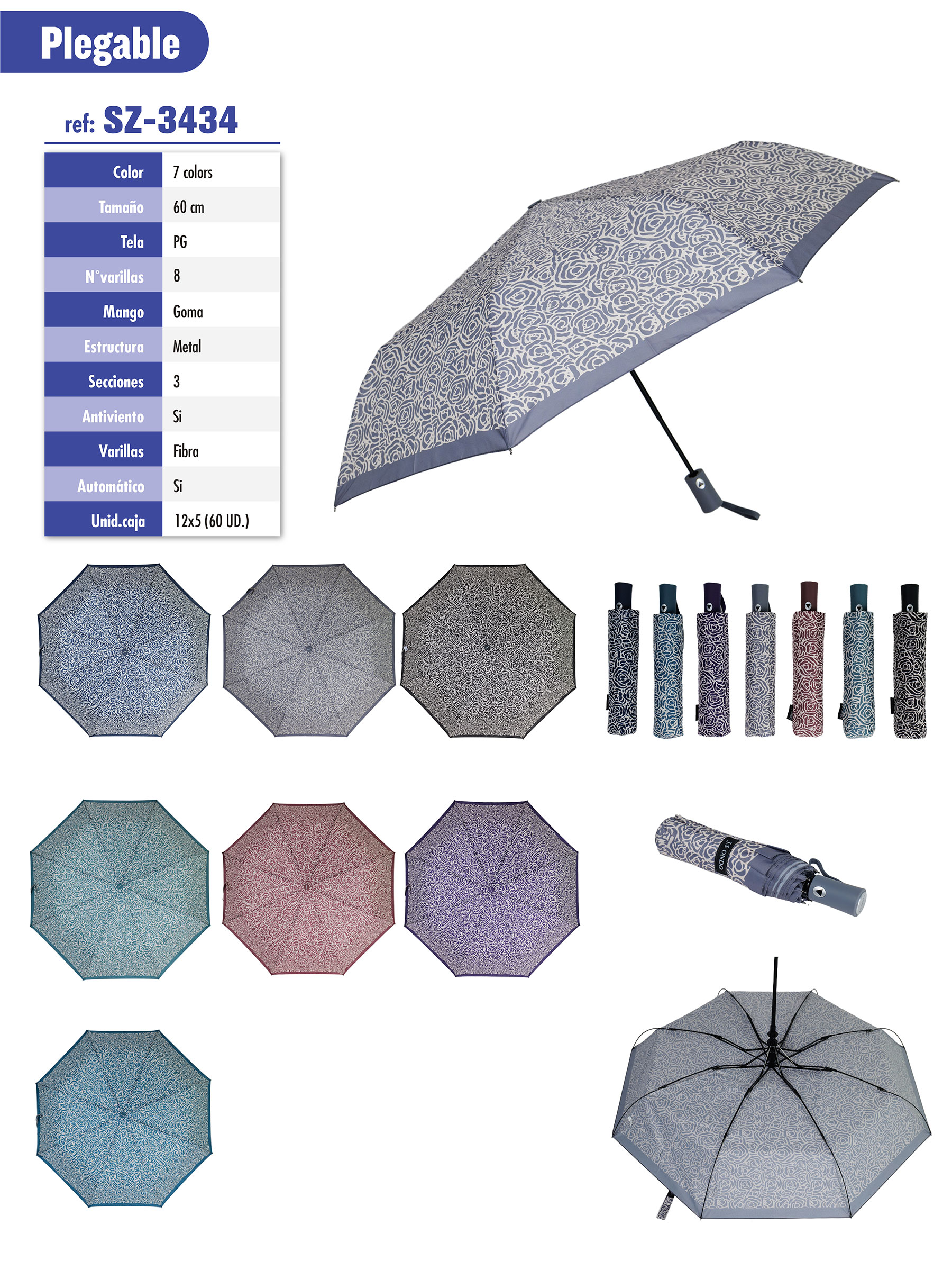 Paraguas plegable rosas. Tela PG. Antiviento. Automático. 8 Varillas de fibra. Mango de goma. Estructura de metal. 3 secciones. Colores surtidos.