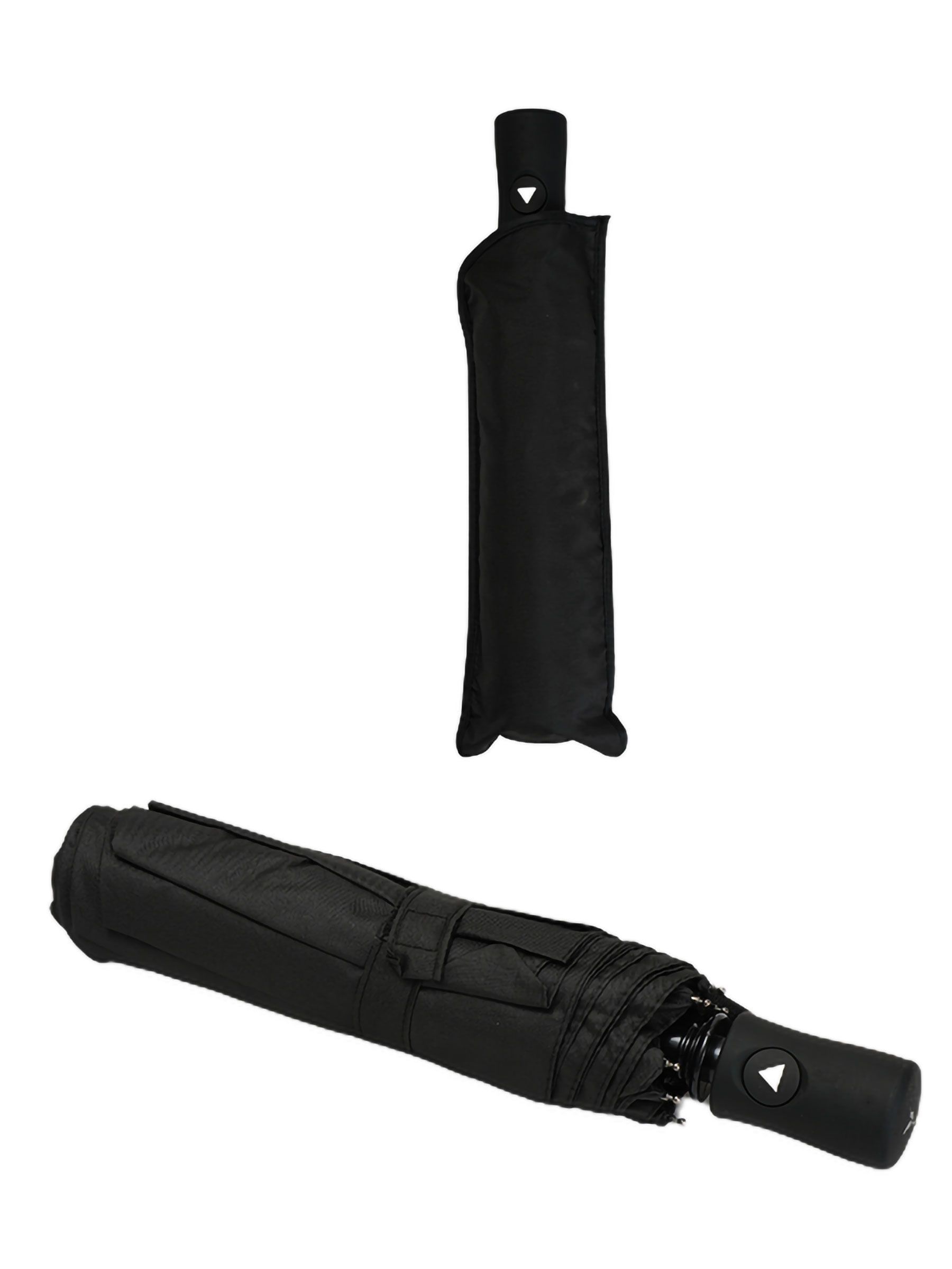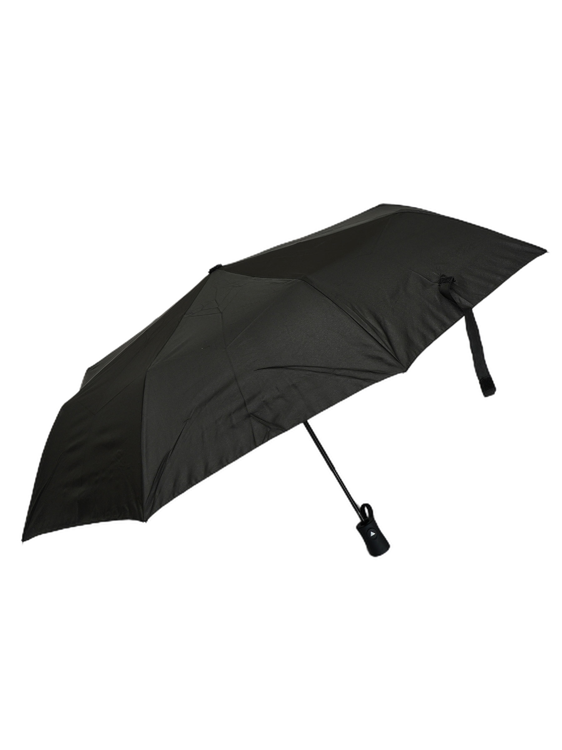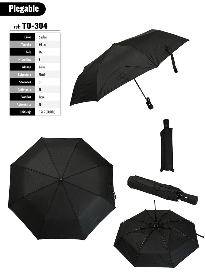 Paraguas plegable negro. Tela PG. Antiviento. Automático. 8 Varillas de fibra. Mango de goma. Estructura de metal. 3 secciones. Colores surtidos.