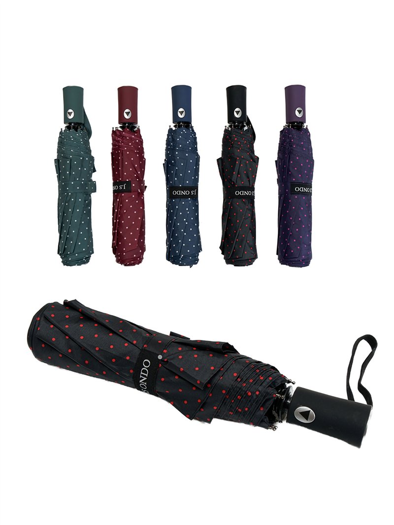 Paraguas plegable lunares. Tela PG. Antiviento. Automático. 8 Varillas de fibra. Mango de goma. Estructura de metal. 3 secciones. Colores surtidos.