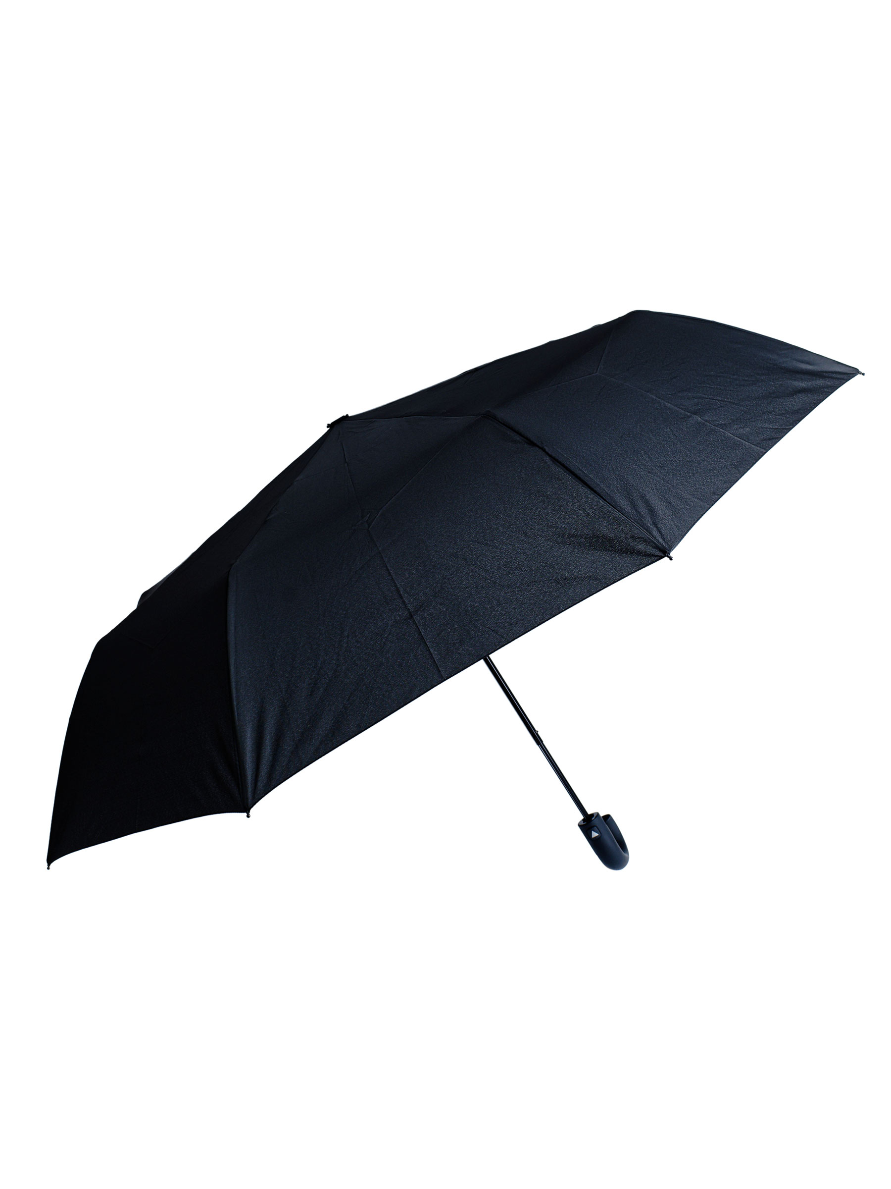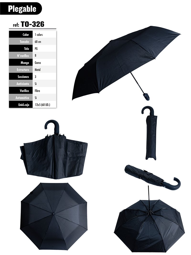 Paraguas plegable negro. Tela PG. Antiviento. Automático. 8 Varillas de fibra. Mango de goma. Estructura de metal. 3 secciones. Colores surtidos.