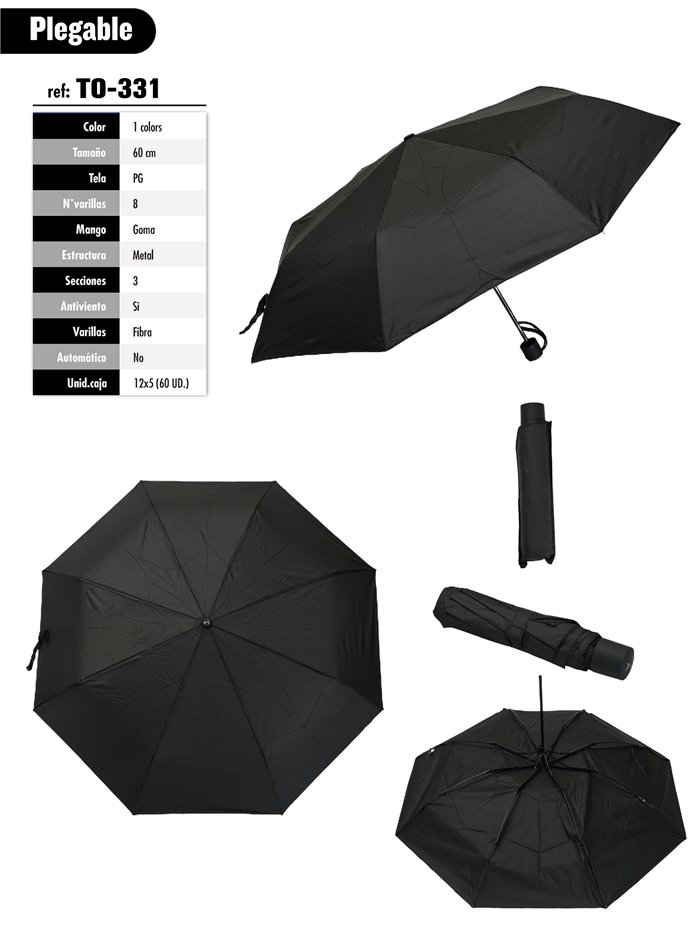 Paraguas plegable negro. Tela PG. Antiviento. No automático. 8 Varillas de fibra. Mango de goma. Estructura de metal. 3 secciones. Colores surtidos.
