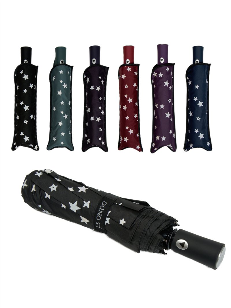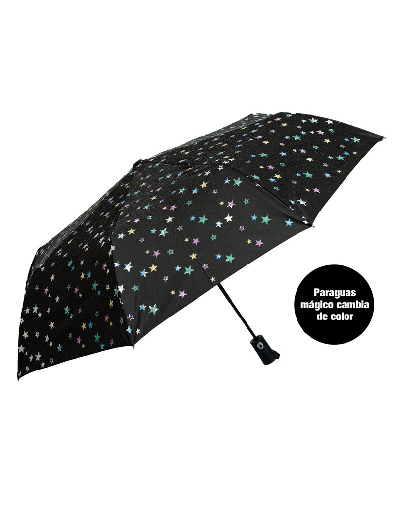 Paraguas plegable estrellas mágicas cambia de color. Tela PG. Antiviento. Automático. 8 Varillas de fibra. Mango de goma. Estructura de metal. 3 secciones. Colores surtidos.