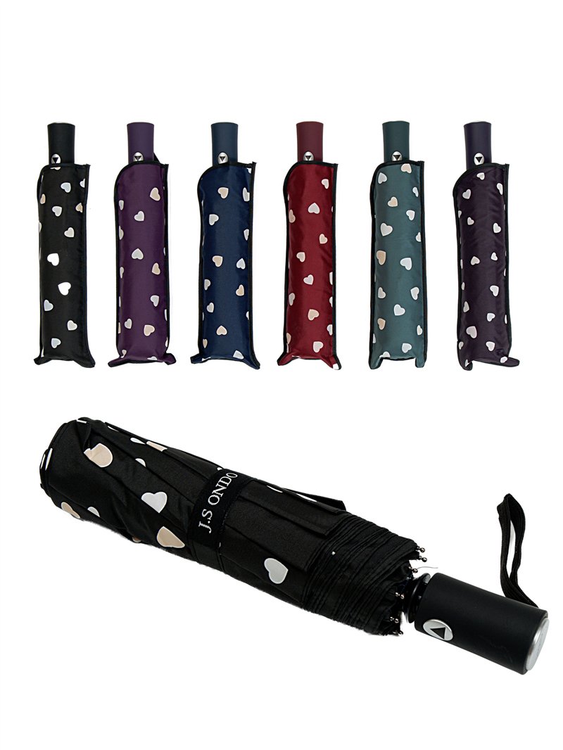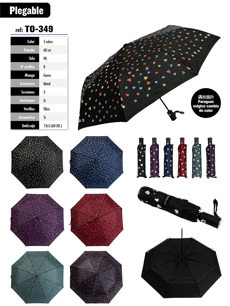 Paraguas plegable corazoncitos mágicos cambia de color. Tela PG. Antiviento. Automático. 8 Varillas de fibra. Mango de goma. Estructura de metal. 3 secciones. Colores surtidos.