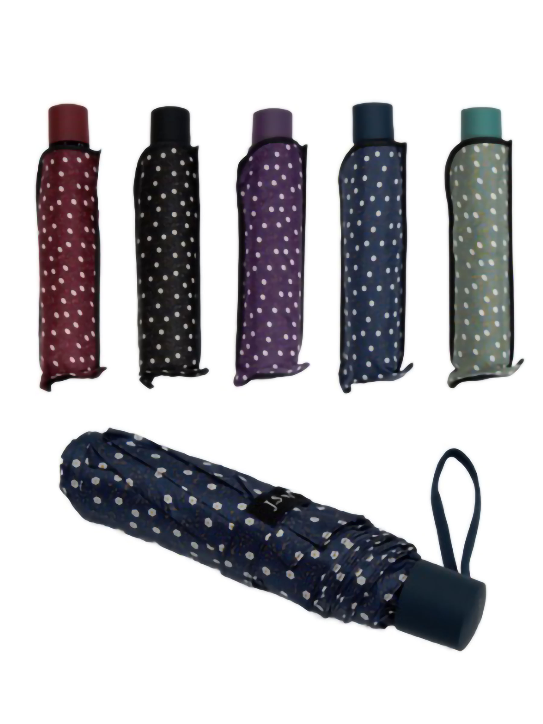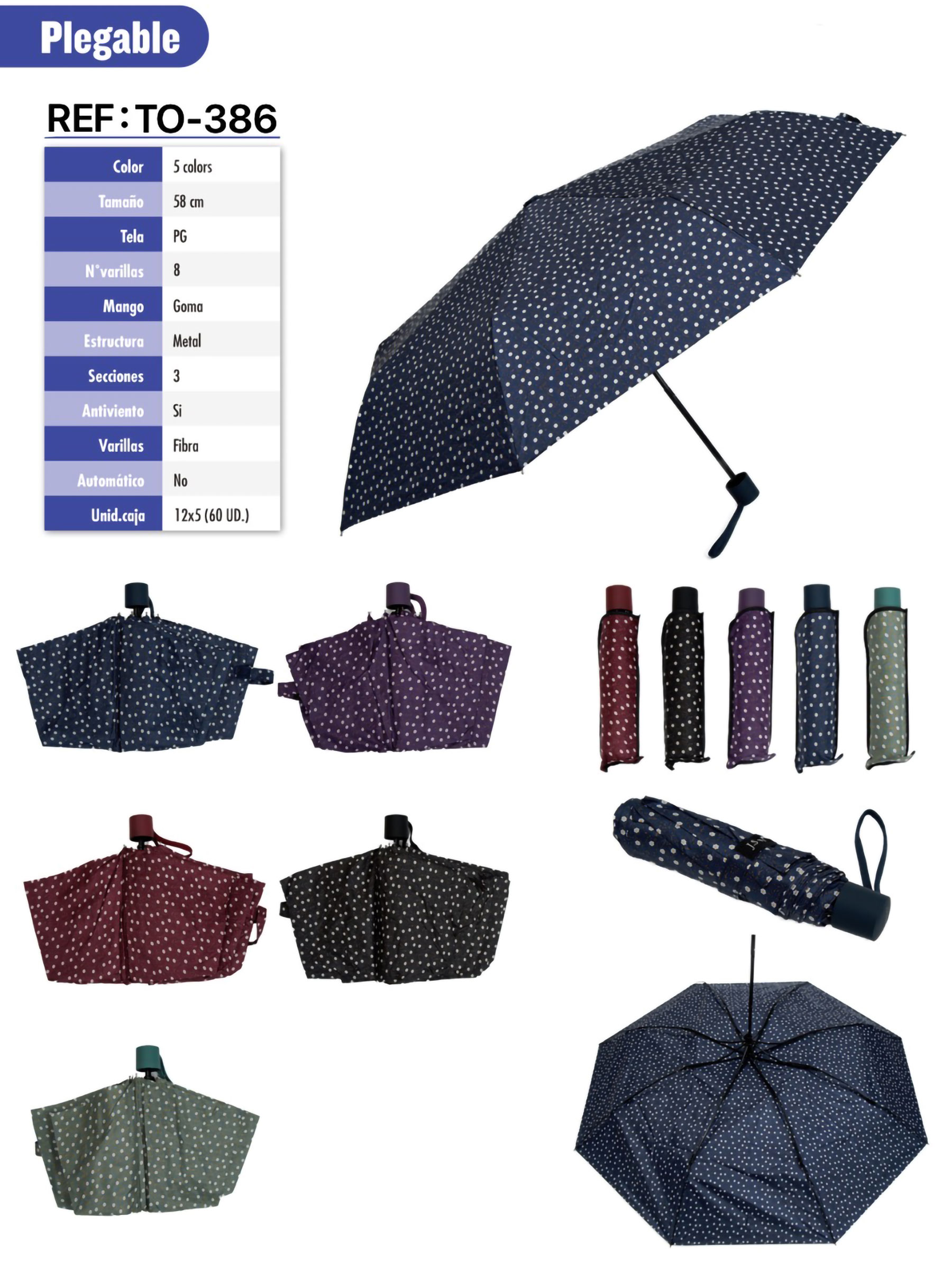 Paraguas plegable lunares. Tela PG. Antiviento. No automático. 8 Varillas de fibra. Mango de goma. Estructura de metal. 3 secciones. Colores surtidos.