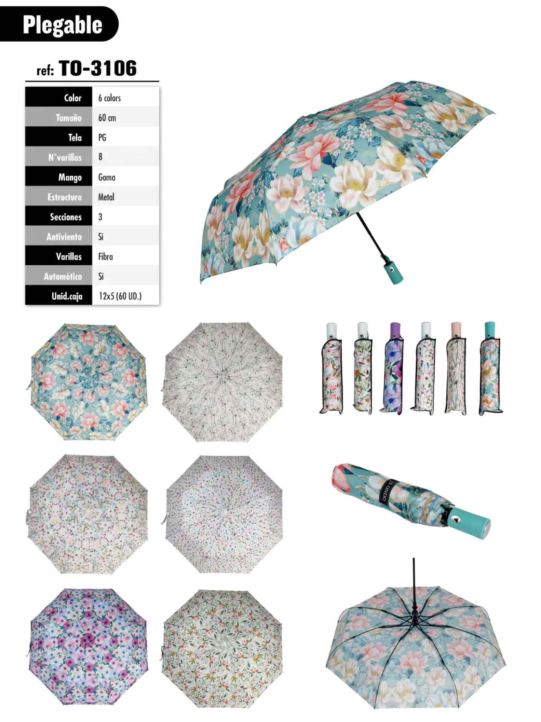 Paraguas plegable floral. Tela PG. Antiviento. Automático. 8 Varillas de fibra. Mango de goma. Estructura de metal. 3 secciones. Colores surtidos.