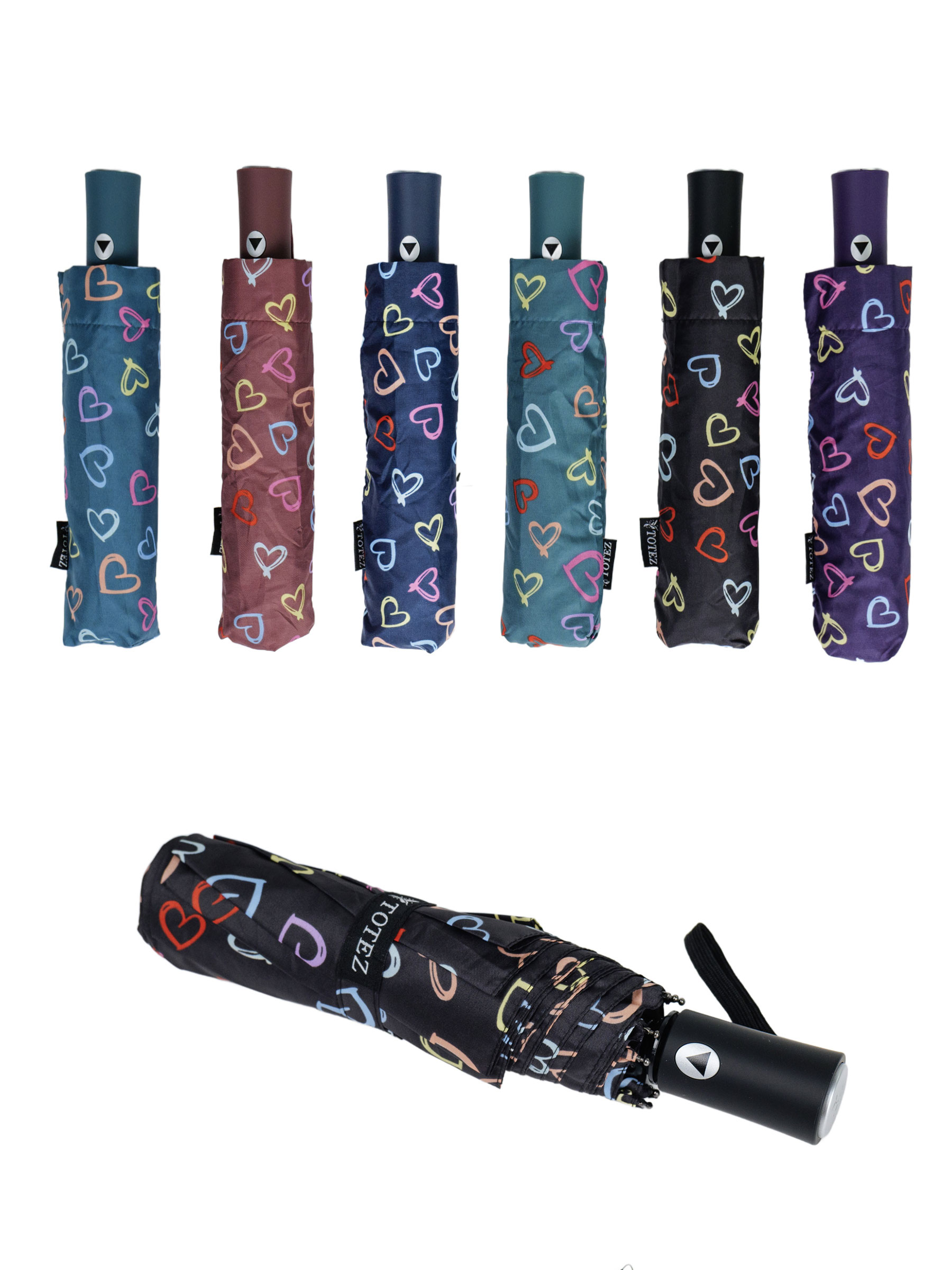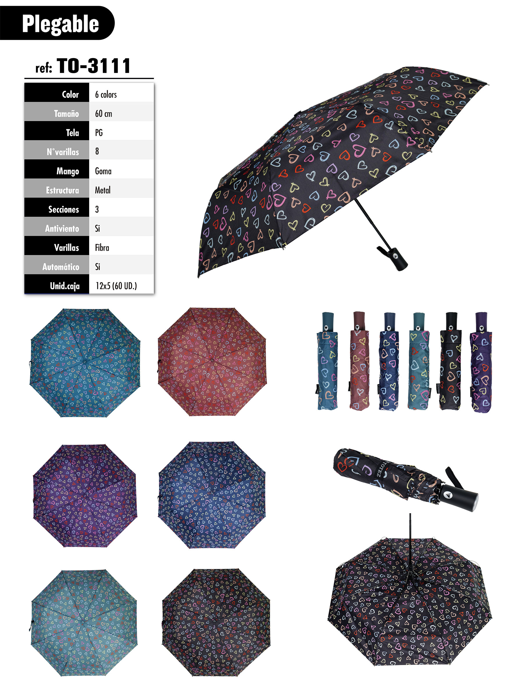 Paraguas plegable corazoncitos. Tela PG. Antiviento. Automático. 8 Varillas de fibra. Mango de goma. Estructura de metal. 3 secciones. Colores surtidos.
