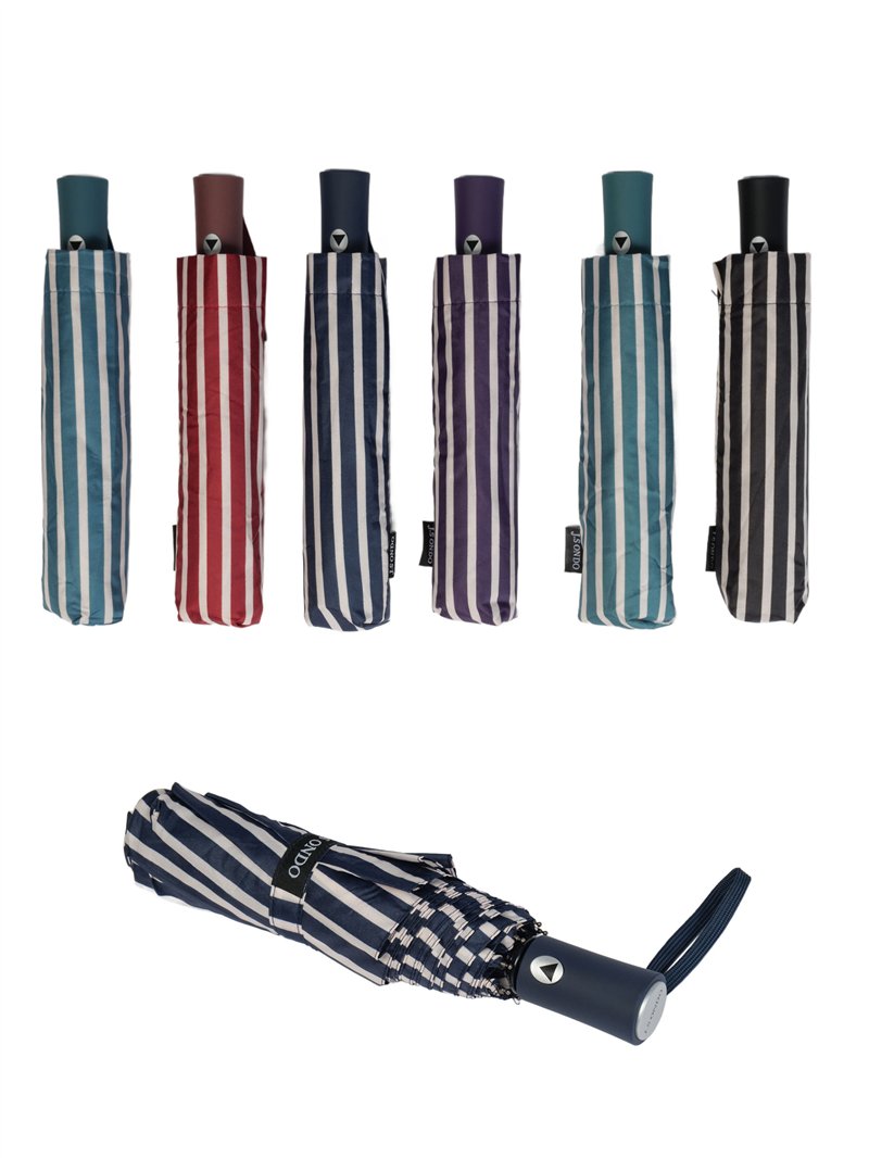 Paraguas plegable rayas. Tela PG. Antiviento. Automático. 8 Varillas de fibra. Mango de goma. Estructura de metal. 3 secciones. Colores surtidos.